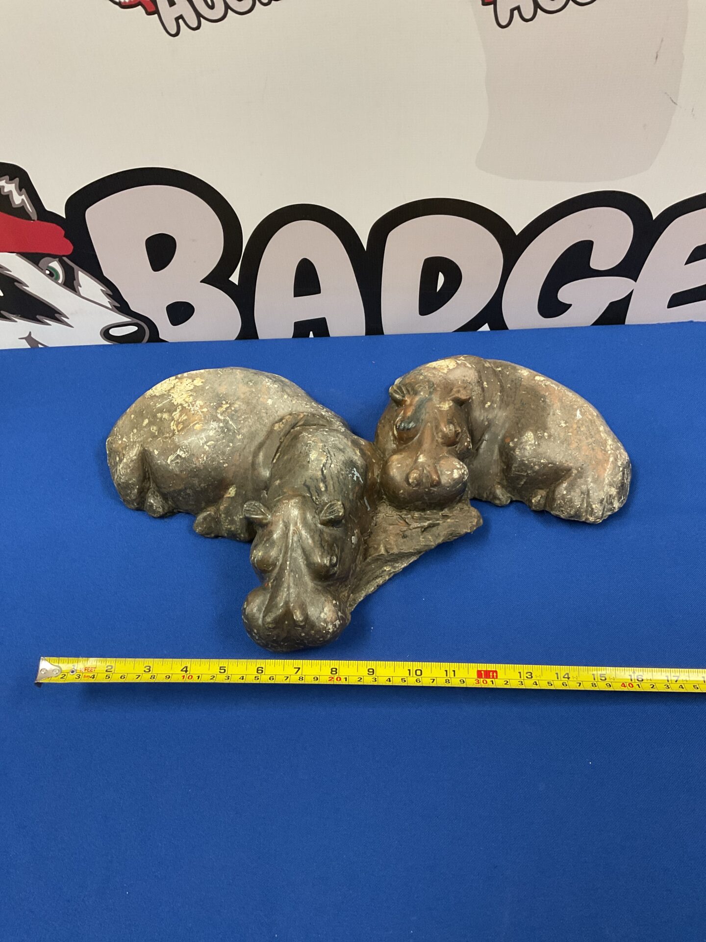 The sculpture shows signs of age and weathering, consistent with its material and likely outdoor display. There are some surface imperfections, including minor chips and abrasions, which contribute to its character. This piece would appeal to collectors of animal sculptures, ethnographic art, or those seeking a unique and substantial garden ornament. The patina and wear suggest authenticity and a history of display.