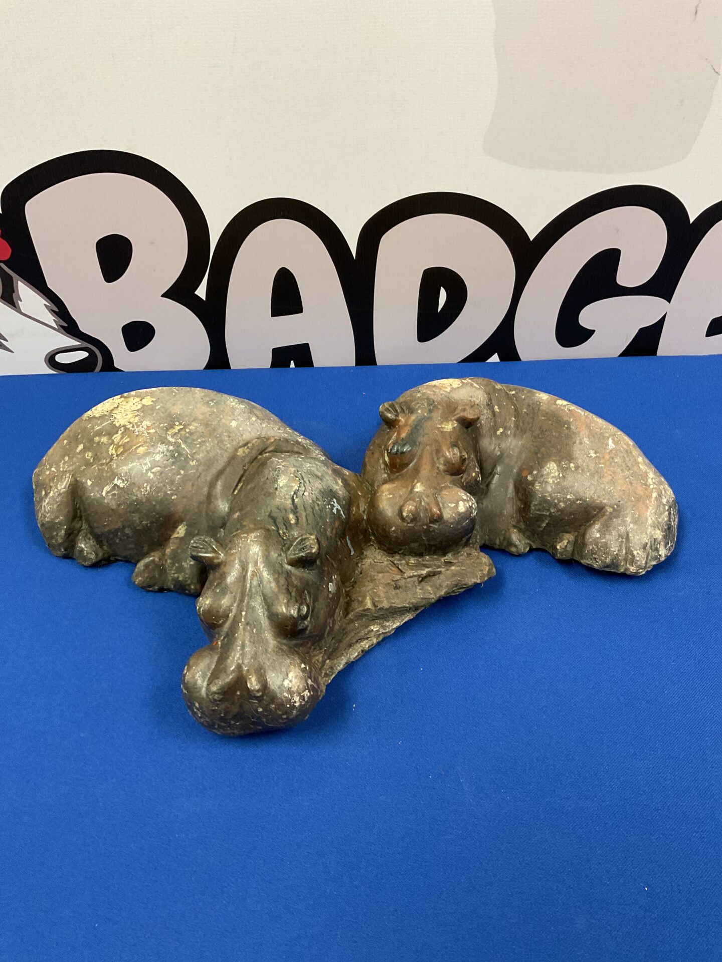 This is a substantial carved stone hippopotamus sculpture. The piece exhibits a robust form, capturing the characteristic bulk and posture of the animal. The stone appears to be a dense variety, lending weight and permanence to the sculpture. The carving style is somewhat simplified, focusing on essential forms rather than intricate detail, suggesting a folk art or primitive aesthetic.