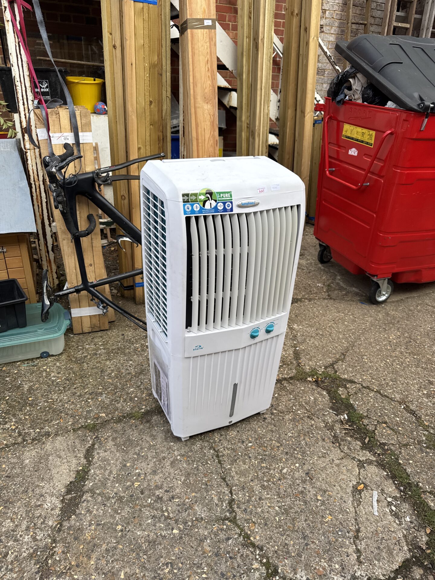 This storm air cooler machine presents as a used item, with signs of prior use and storage. While the unit appears structurally intact, its operational status is unknown. This machine may appeal to collectors of vintage cooling technology, those seeking parts for repair, or individuals interested in repurposing the unit for a unique project.