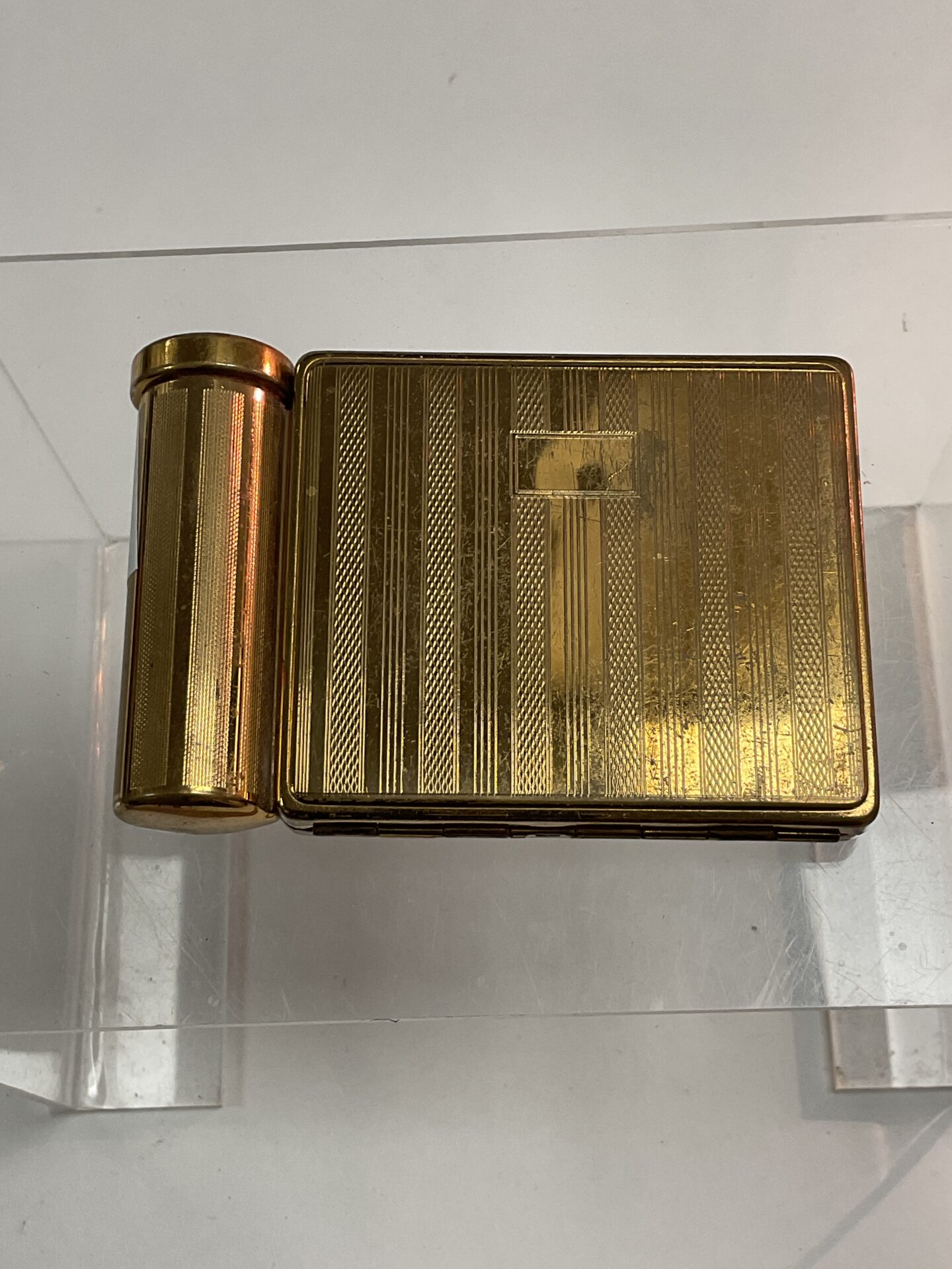This vintage Stratton compact shows signs consistent with age and use, adding to its character. It would appeal to collectors of vintage vanity items, art deco enthusiasts, or those seeking a unique and stylish accessory. The compact’s condition and design make it a desirable addition to any collection or a charming piece for personal use.