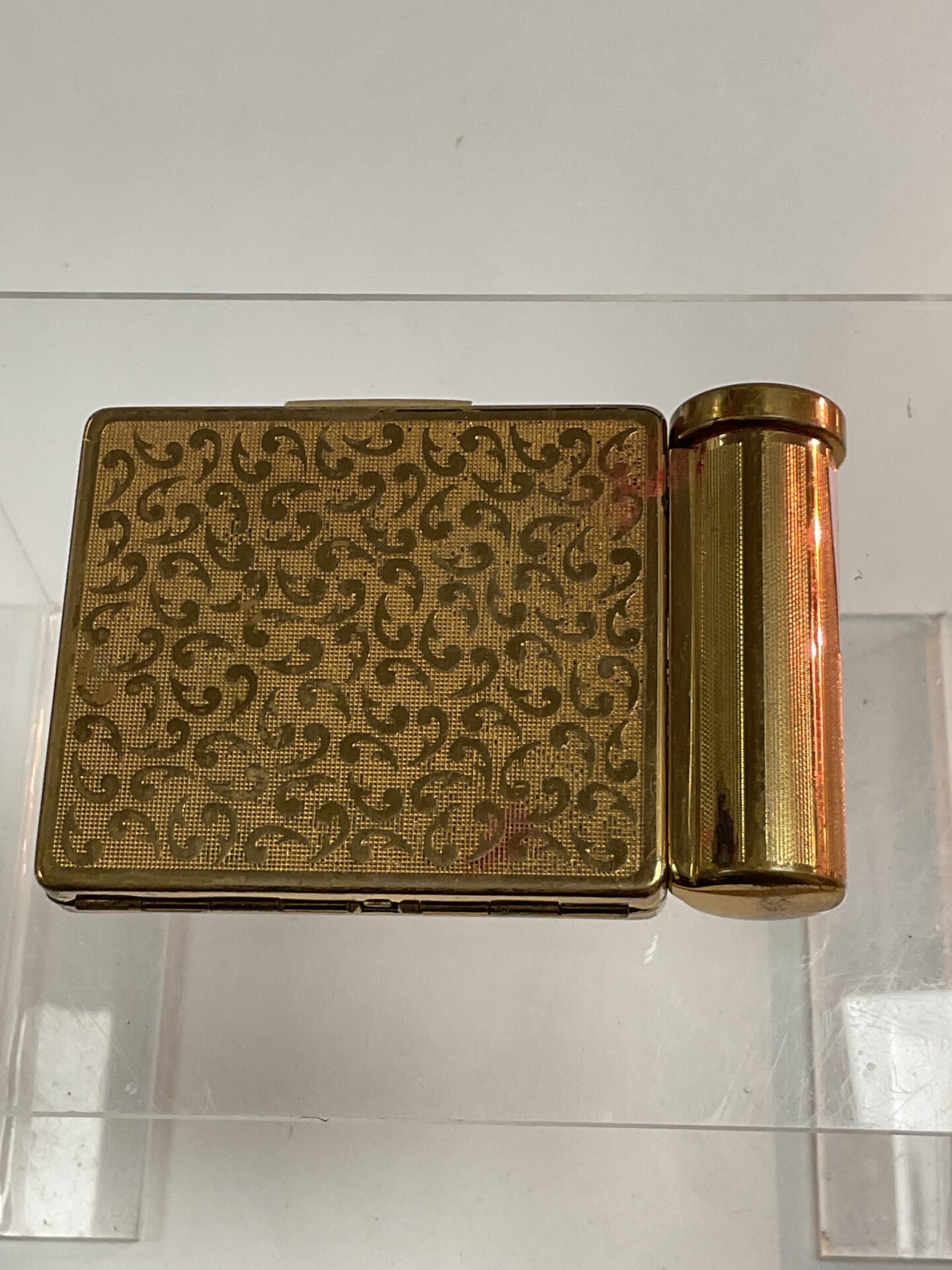 This vintage Stratton compact mirror features a gold-tone finish and a built-in lipstick holder. A classic art deco design makes this compact a stylish and collectible piece. Perfect for collectors of vintage vanity items or as a unique accessory.