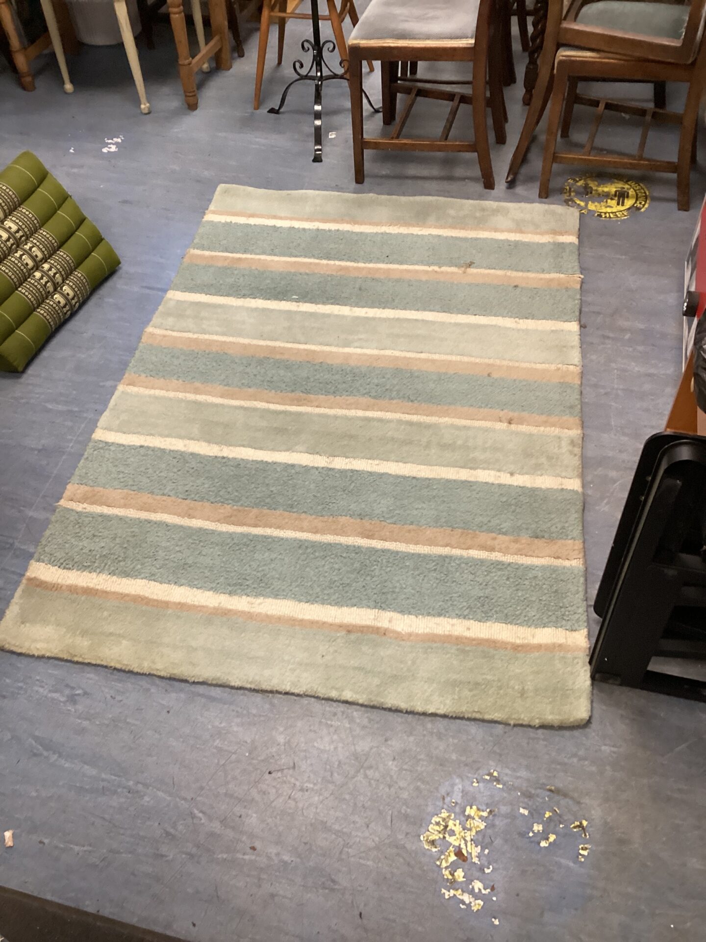 This is a striped rug, featuring a colour palette of blue, brown, and cream. The rug appears to be in a classic style, suitable for a variety of interior décor schemes. Its striped pattern adds visual interest and can complement both modern and traditional settings.