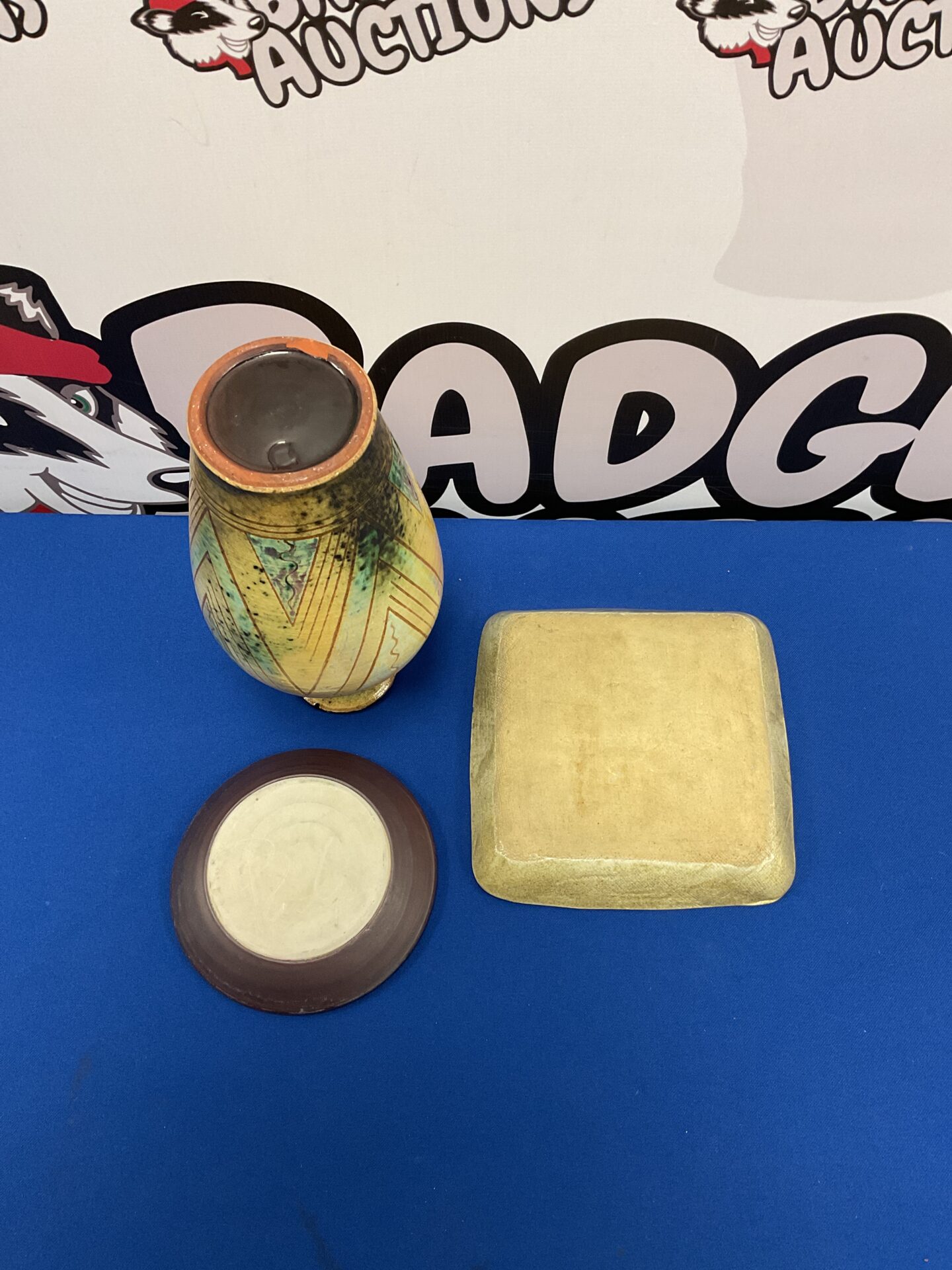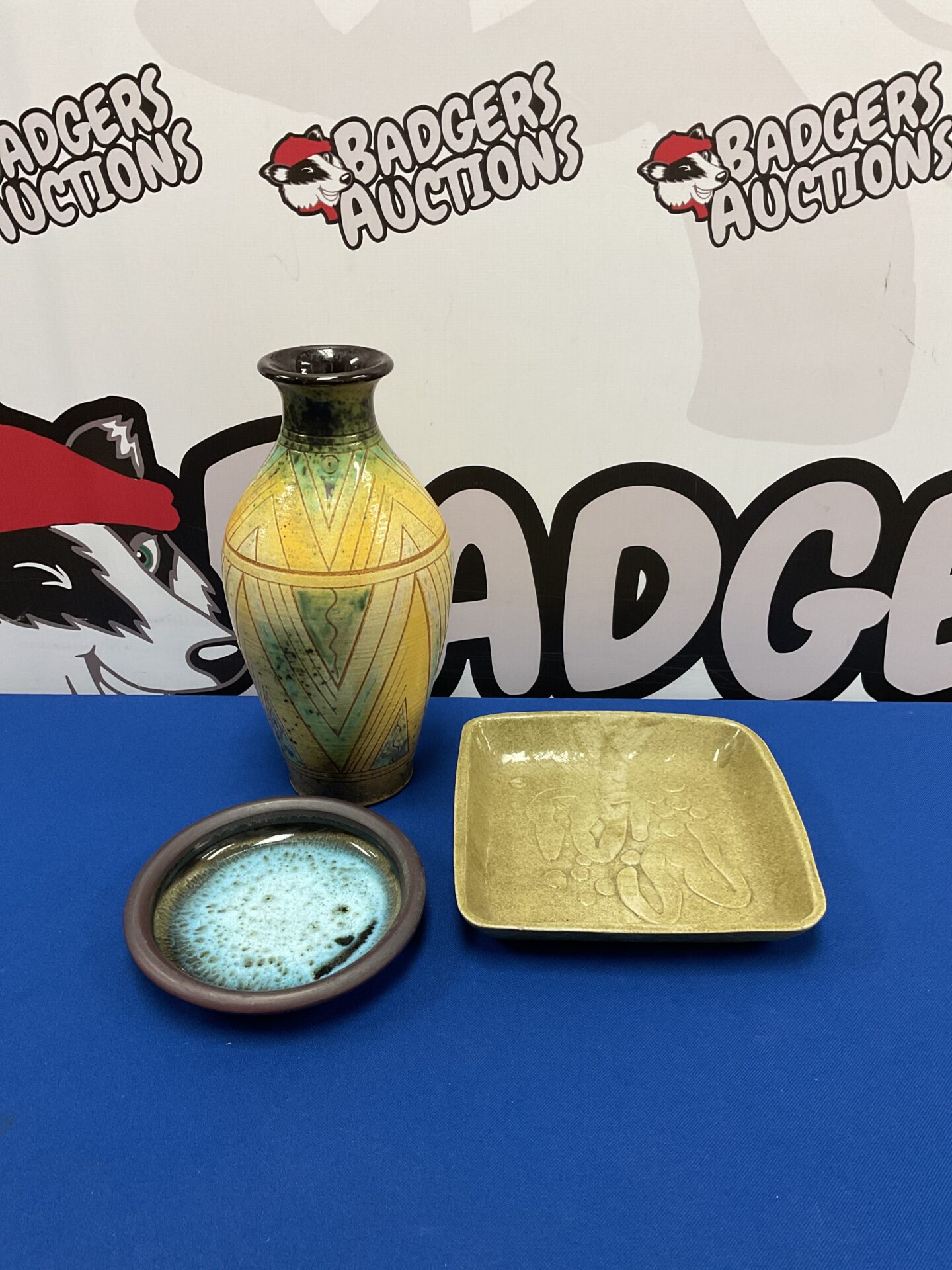 This collection comprises a signed studio pottery vase and two studio pottery dishes. The vase features a vibrant yellow glaze with contrasting green and brown detailing, showcasing a unique hand-thrown form. The two dishes exhibit differing glazes – one a speckled teal and the other a textured gold – adding to the eclectic nature of this handmade set.