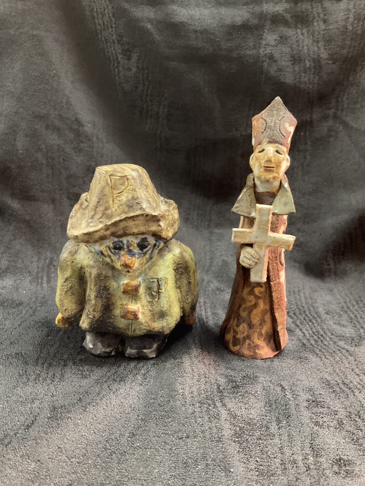 This charming lot comprises two studio pottery figurines: a depiction of Paddington Bear and an Archbishop of Westminster. Both figures exhibit a hand-crafted aesthetic, with textured surfaces and expressive modelling. The Paddington Bear figure is approximately 6” tall and captures the beloved character’s iconic look, while the Archbishop figure, also hand-built, is dressed in ecclesiastical robes and holds a cross. These pieces likely date from the mid-20th century and showcase the skill of a studio potter.