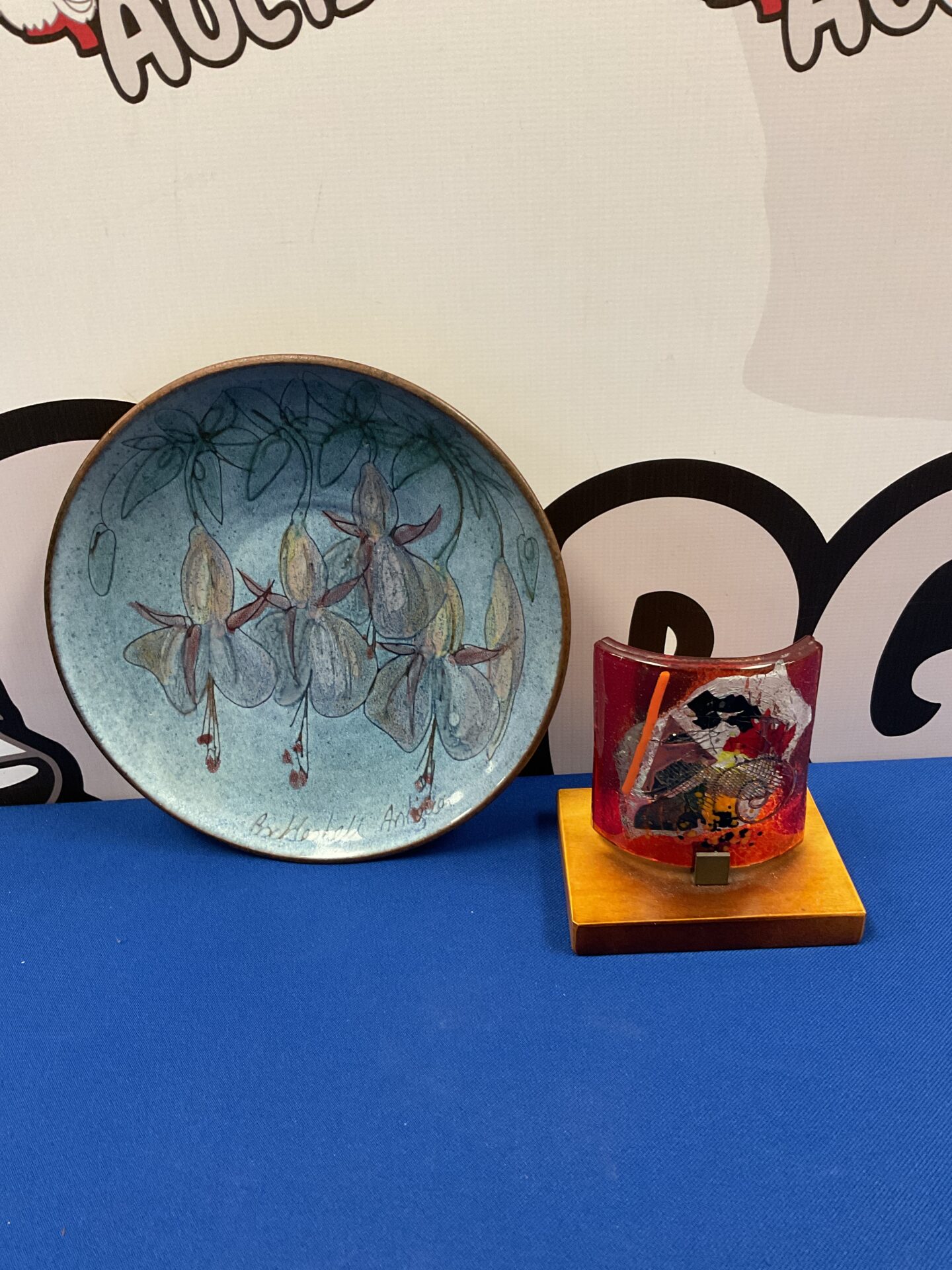 Both pieces appear to be in good condition, with signs of age and wear consistent with vintage items. The plate is signed by the artist, enhancing its collectibility and provenance. This pairing would appeal to collectors of studio pottery and art glass, as well as those seeking unique decorative pieces for their home.