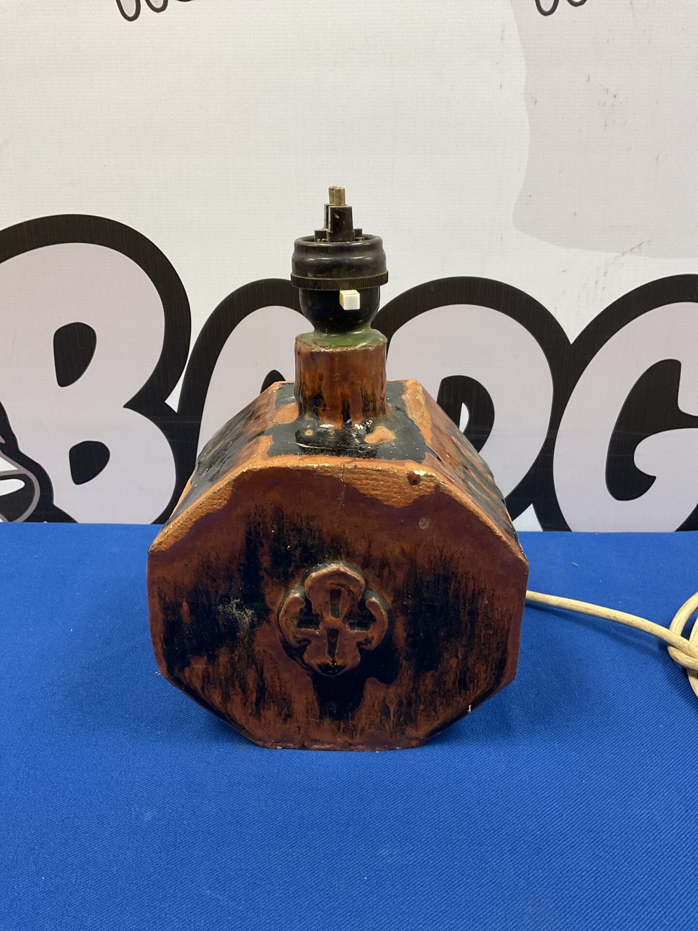 The lamp presents as a vintage item with signs consistent with age and use. The glaze exhibits some minor imperfections and wear, which are characteristic of handmade pottery. The electrical components have not been tested and are sold as-is. This lamp would be of interest to collectors of studio pottery, mid-century modern design, or unique lighting fixtures, offering a chance to own a piece of artistic craftsmanship.