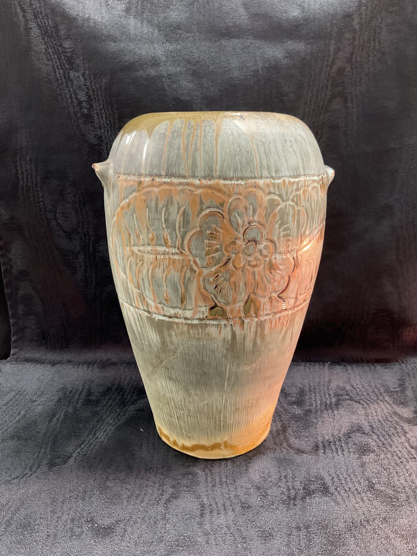This striking studio pottery vase hails from Weston Super Mare and showcases a beautifully textured surface. The vase features a bulbous form with a slightly tapered base and a narrow neck, adorned with embossed floral detailing. The earthy tones and tactile finish give it a rustic yet sophisticated appeal, characteristic of mid-century modern ceramic design. It’s a unique piece that would serve as a stunning focal point in any room.