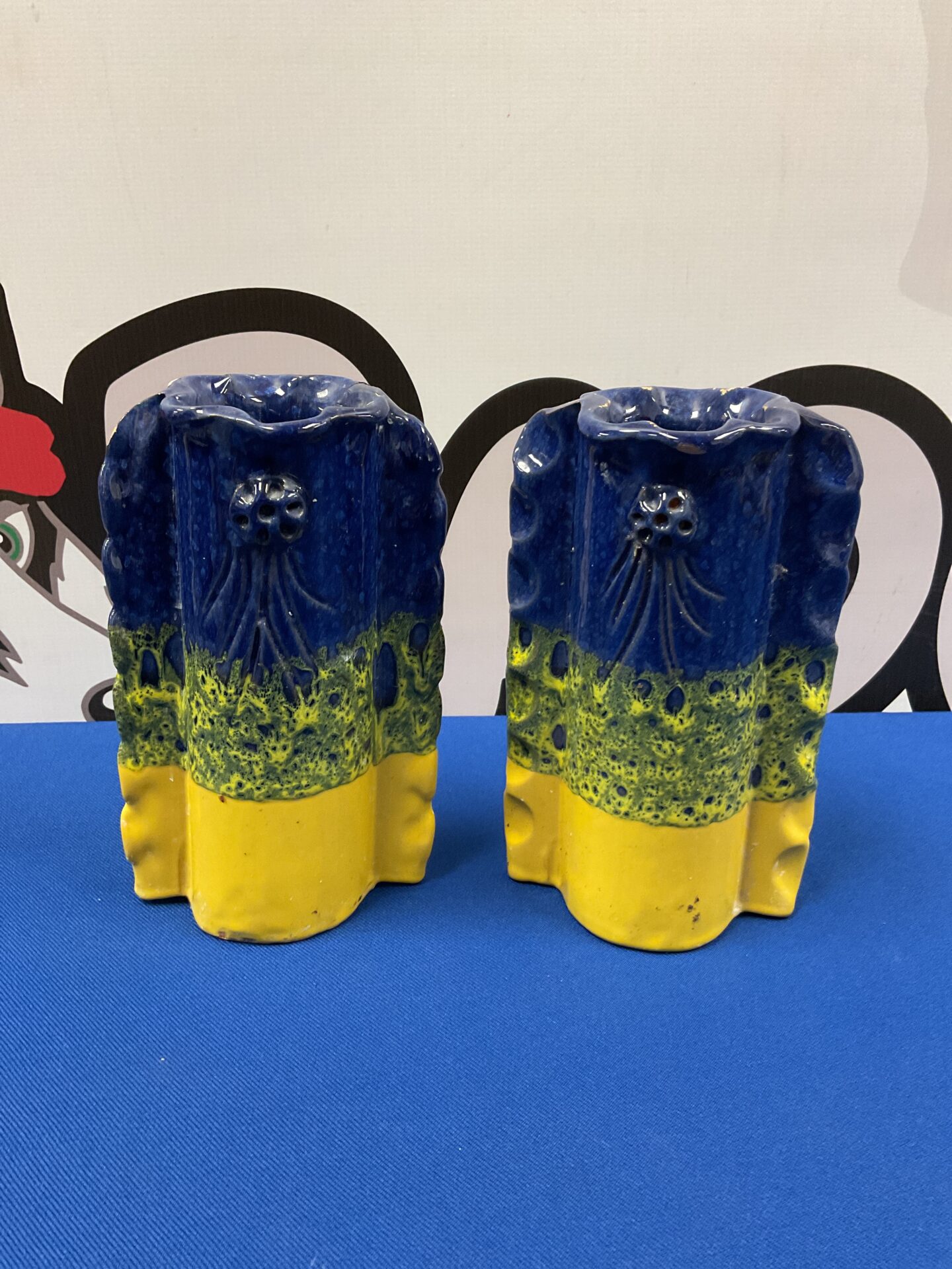 This pair of striking studio pottery vases showcases a vibrant colour palette and unique sculptural form. The vases feature a deep blue glaze that transitions into a textured yellow base, creating a visually dynamic effect. The undulating, petal-like design adds a touch of organic modernism, indicative of mid-century ceramic artistry.