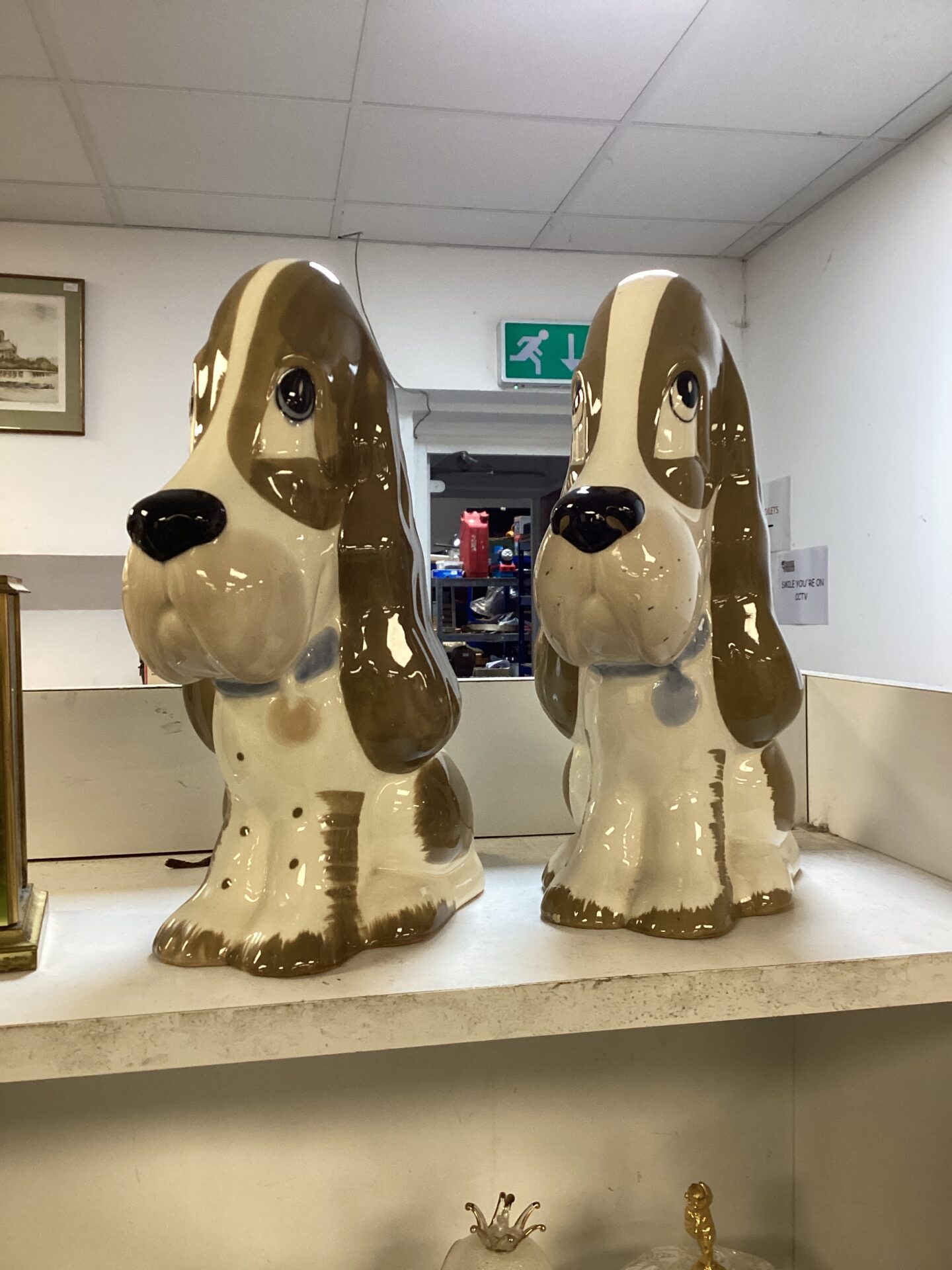 These charming ceramic dogs are by Studio Szeiler, a well-known maker of mid-century kitsch ornaments. The pair are modelled as basset hounds, with detailed facial features and a glossy glaze. One of the dogs functions as a money box, with a coin slot in its back. These pieces are representative of the playful and colourful aesthetic popular in the 1960s and 70s.