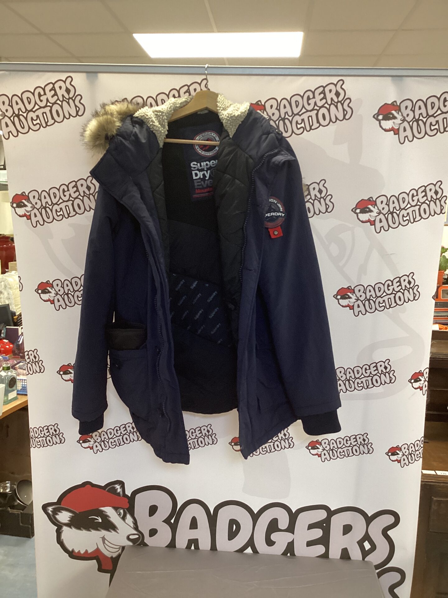 This is a Superdry Everest edition parka coat, a stylish and functional piece of outerwear. The coat features a durable outer shell designed to withstand colder weather, and a quilted lining for added warmth. It boasts multiple pockets for practical storage, a detachable hood, and the signature Superdry branding.