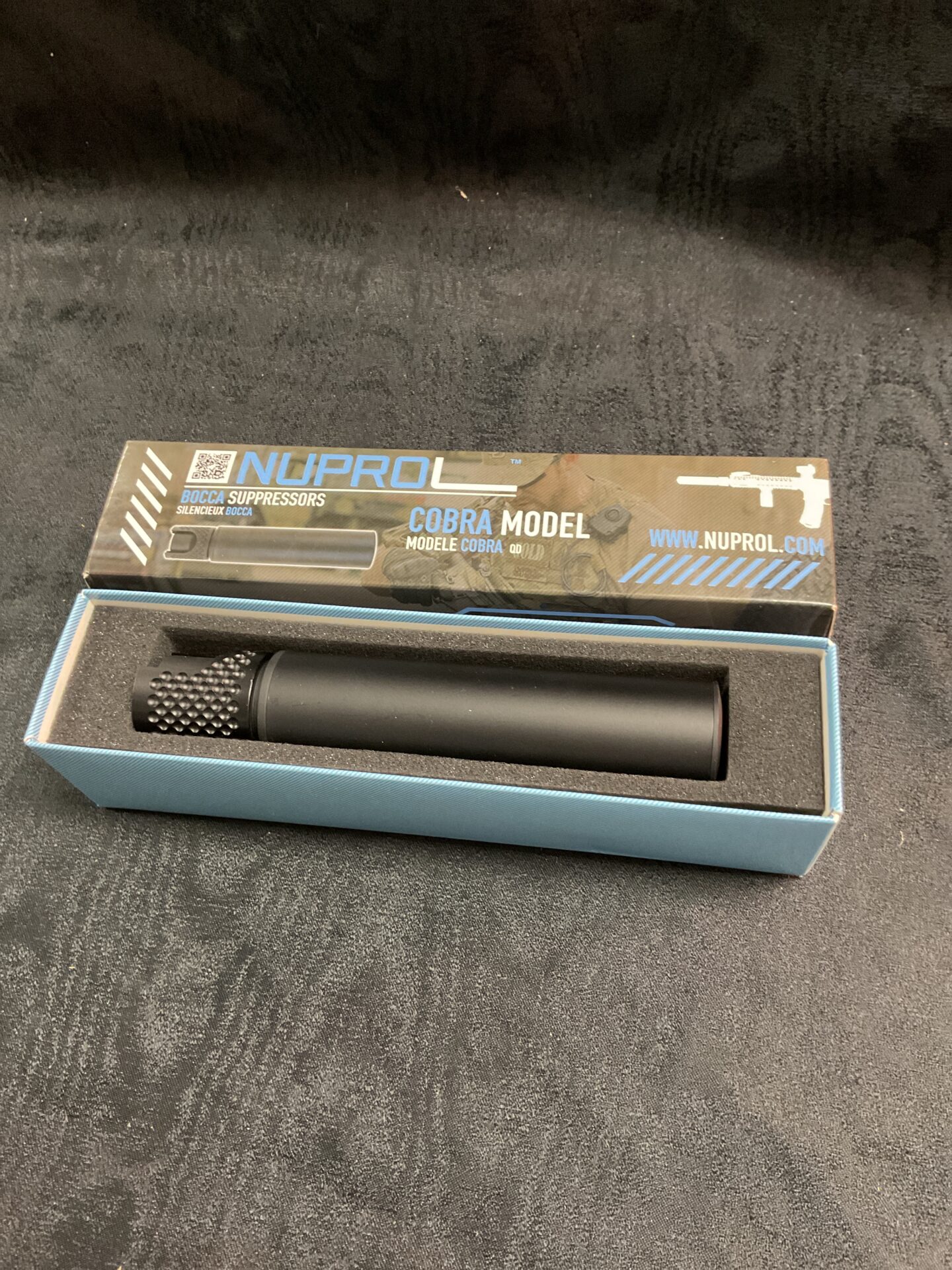 This is a Bocca Suppressors Cobra model suppressor. It features a robust construction, designed for firearm use. The suppressor is intended to reduce the sound signature of a firearm when discharged.