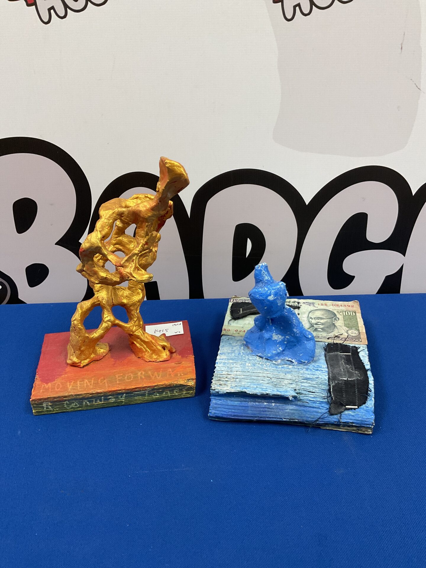 009 Two R Conway Jones Signed Surreal Sculptures On Wooden Bases One Of Gandhi & Other Titled Moving Forward