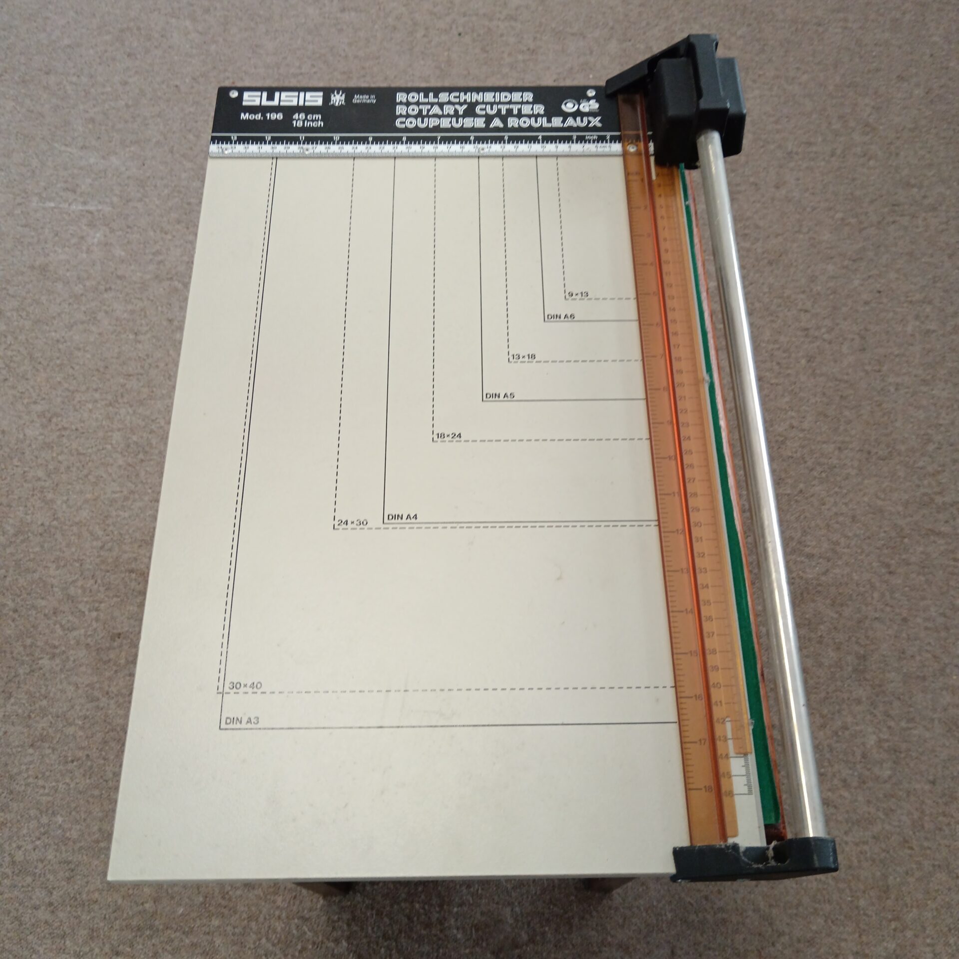This is a Susis Mod 196 rotary cutter, a vintage tool designed for precision cutting of paper, fabric, and other materials. The cutter features a robust metal construction and a circular blade housed within a protective casing. The design allows for smooth, straight cuts, making it ideal for crafting, scrapbooking, and other detailed work. The cutter is marked with “Susis” and “Mod. 196” on the body.