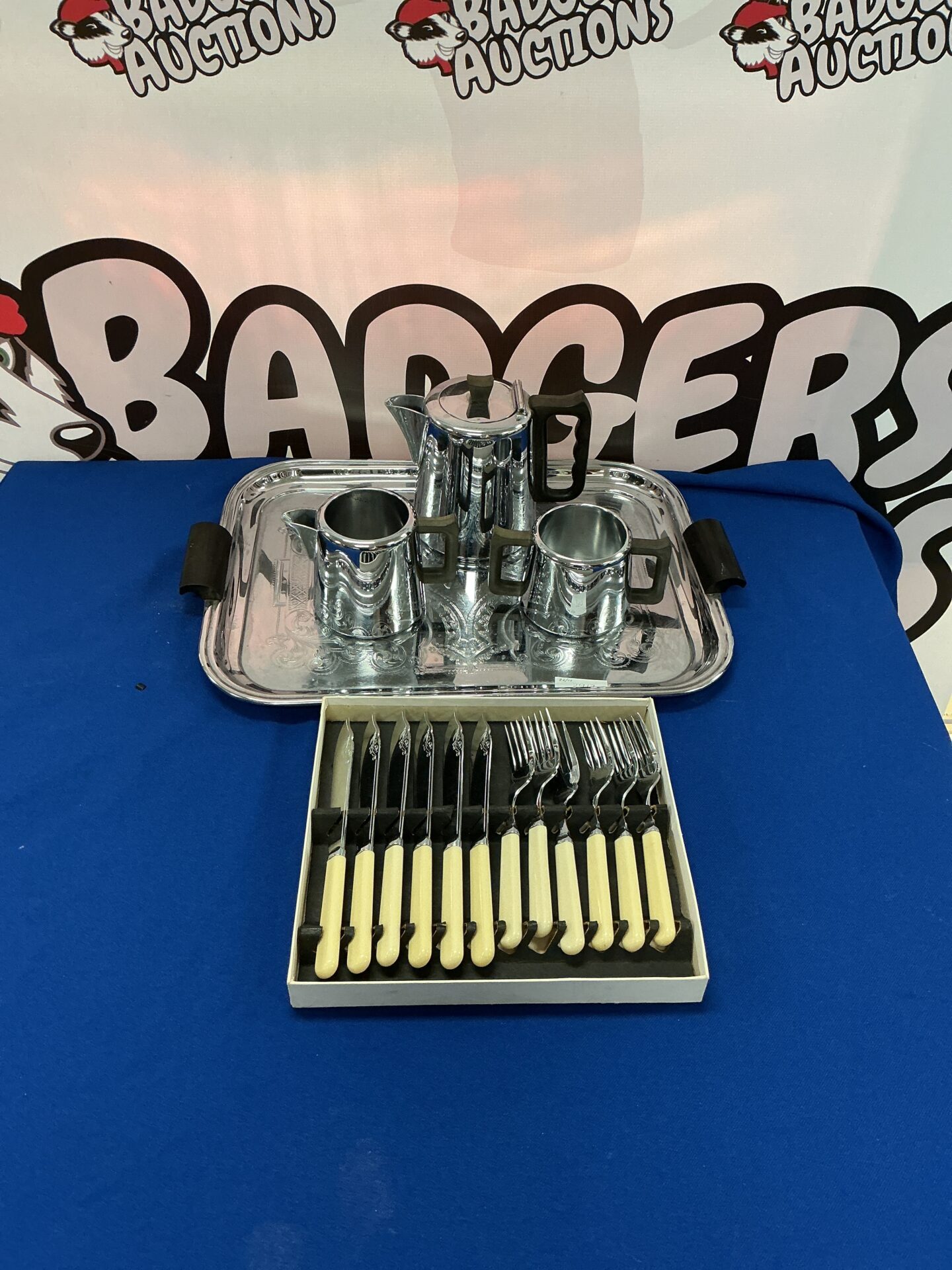 This elegant coffee set by Swan comprises a coffee pot, sugar bowl, milk jug, and a serving tray, all crafted from polished stainless steel. Accompanying this set is a complete fish cutlery service, including knives and forks, perfect for enjoying seafood dishes. The set exudes a classic mid-century aesthetic, combining functionality with stylish design, and is ideal for both everyday use and special occasions.