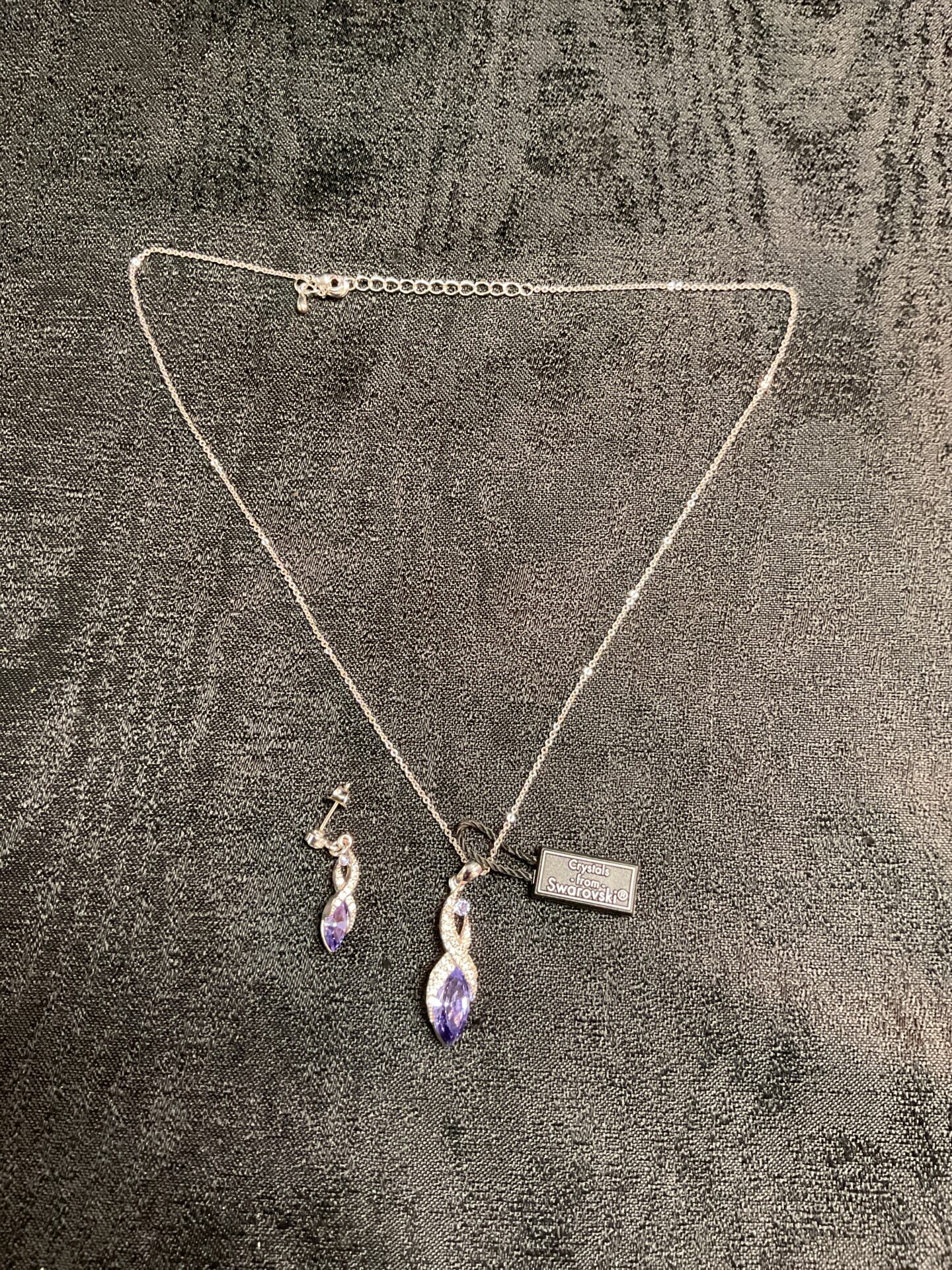 This elegant necklace features a silver-tone chain adorned with multiple Swarovski crystal pendants. The pendants showcase a beautiful purple hue, adding a touch of sophistication and colour to the piece. The design incorporates a single matching earring, suggesting it was originally part of a set.