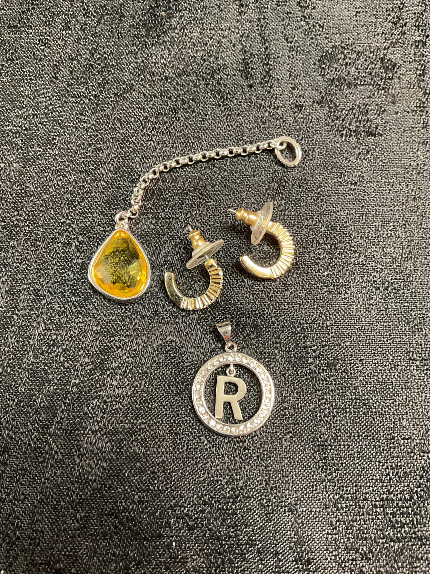 This jewellery set features a vibrant yellow Swarovski crystal pendant, complemented by a matching pair of earrings. Additionally, a separate pendant displaying the letter “R” is included, offering a personalized touch. The set showcases Swarovski’s signature precision-cut crystals, known for their brilliance and quality.