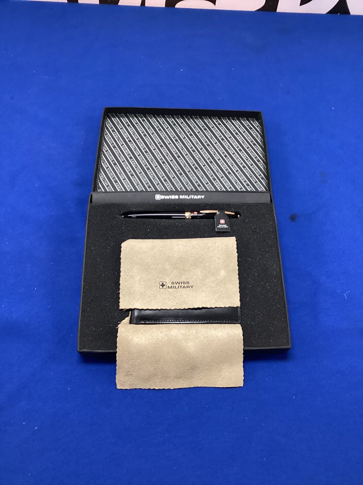 This Swiss Army gift set appears to be in used condition, with signs of wear consistent with age and handling. It presents an opportunity for collectors of Swiss Army memorabilia or those seeking a functional and vintage multi-tool set. The set’s presentation case adds to its appeal, making it a unique display piece or a practical addition to a survival kit.