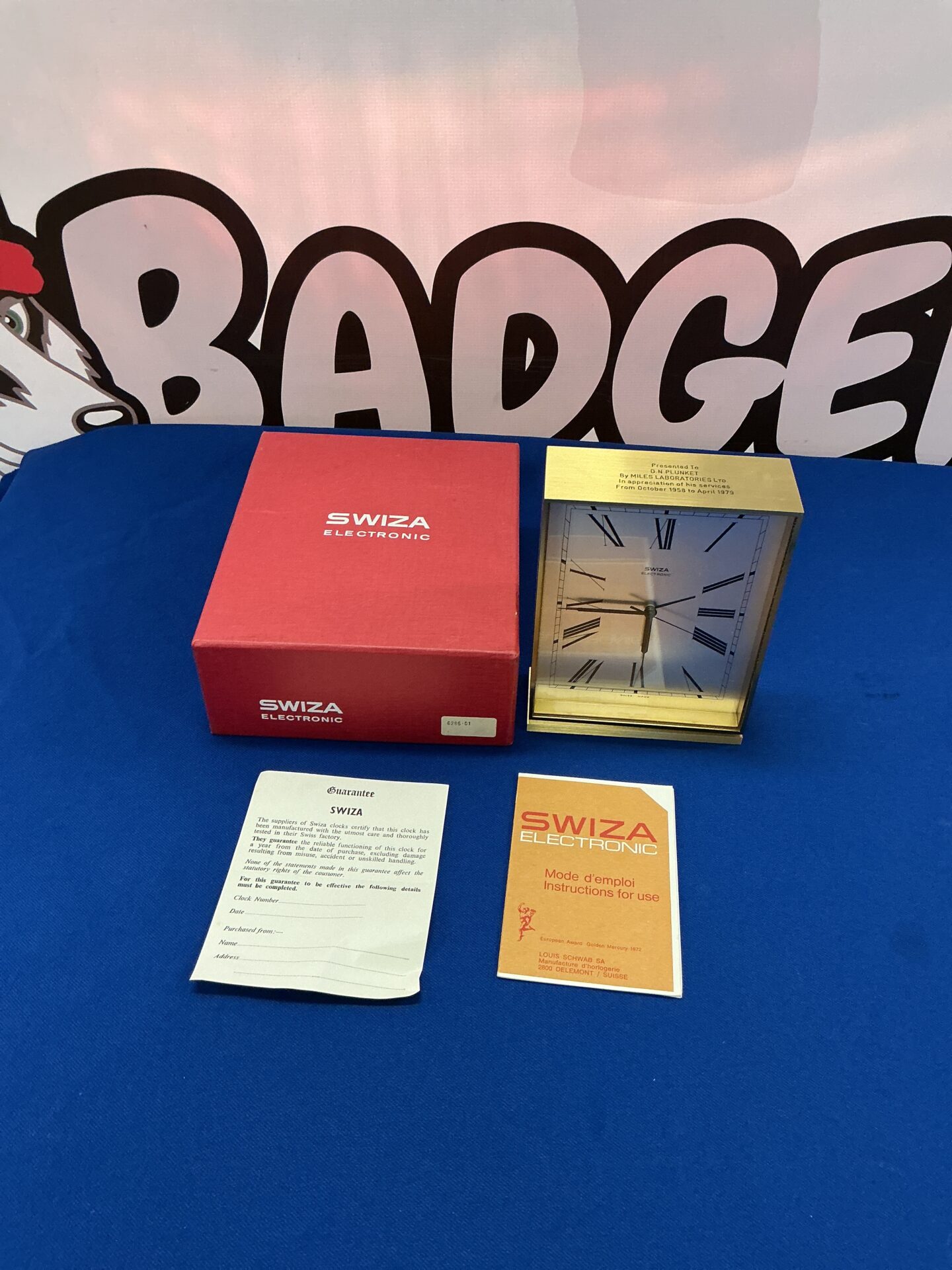 The clock is in excellent vintage condition, showing minimal signs of wear consistent with its age. The case is clean and well-maintained, and the electronic movement is functioning correctly. The original box is also in good condition, providing a complete and desirable package for collectors of vintage clocks and Swiss-made goods. This Swiza clock is a rare find and a valuable addition to any collection.