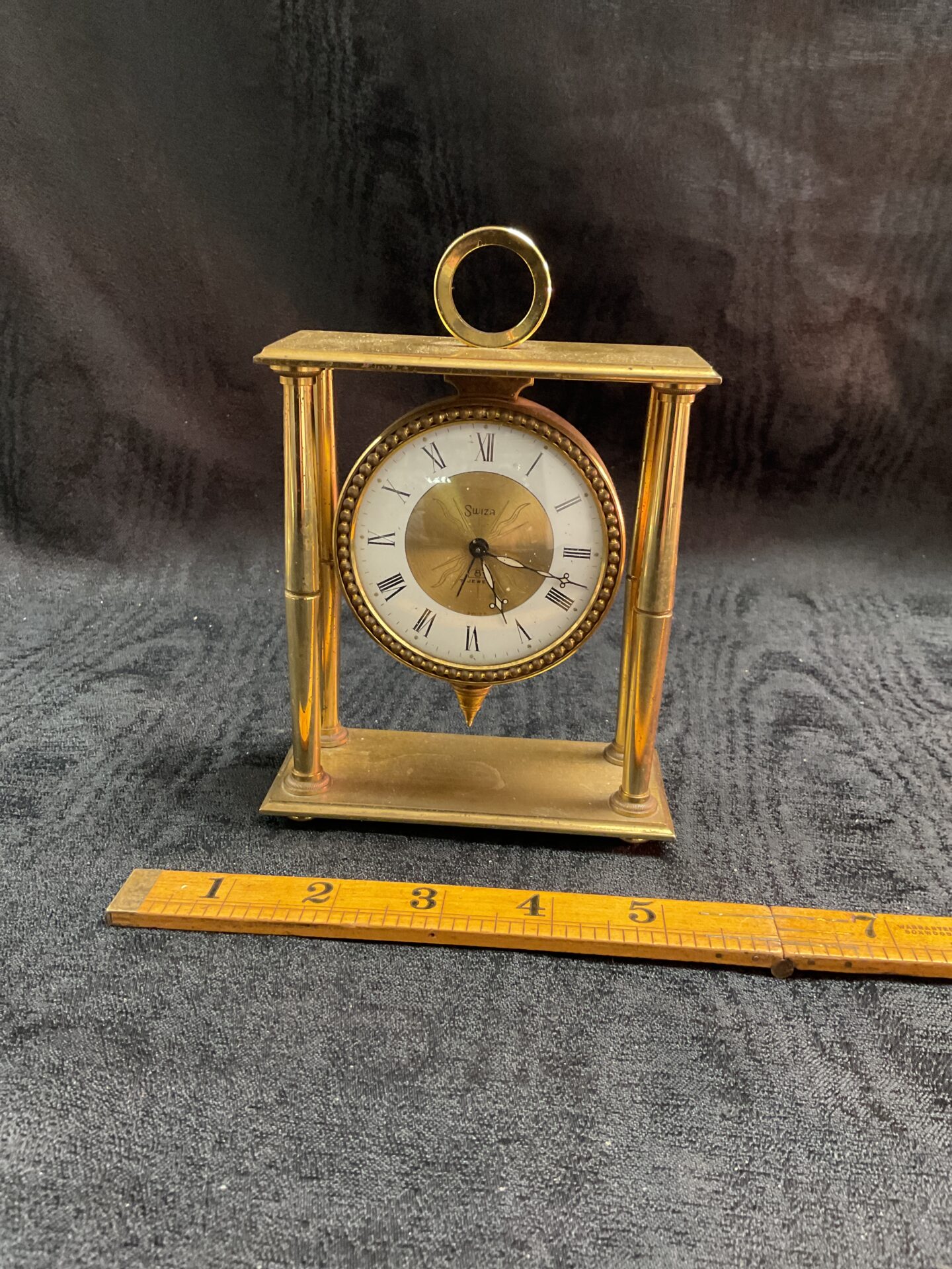 This is a Swiza brass mantle clock, a classic timepiece designed for display on a shelf or desk. The clock features a traditional design with a white dial, black hands, and a brass case. The Swiza brand is known for producing quality clocks, and this piece exemplifies their commitment to craftsmanship.