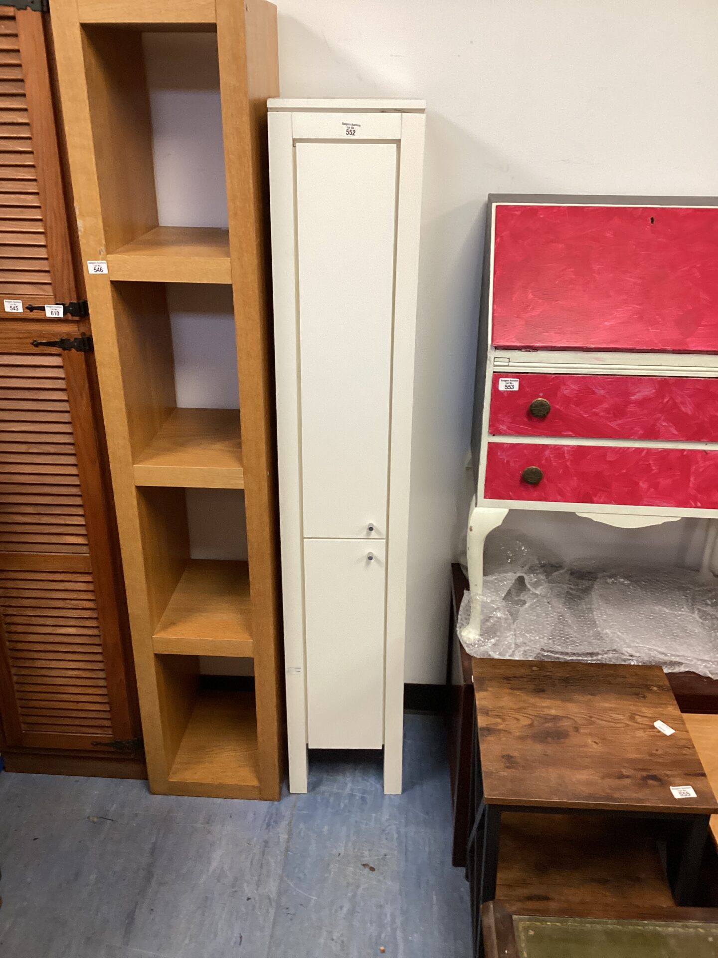 This is a tall, narrow white cupboard, offering a practical storage solution. Its simple design suggests a mid-century aesthetic, potentially intended for hallway or linen storage. The cupboard features a single door and internal shelving, providing versatile space for various items.
