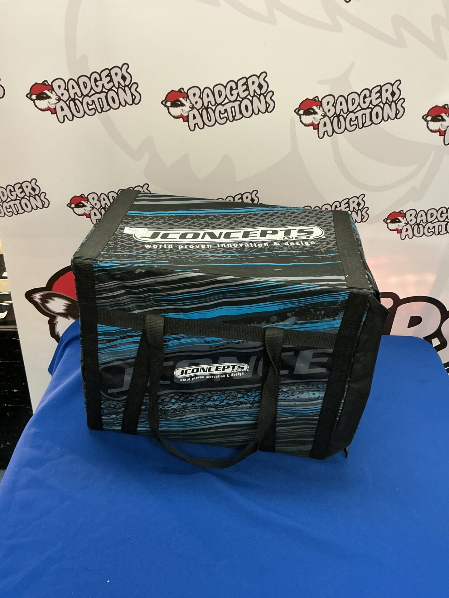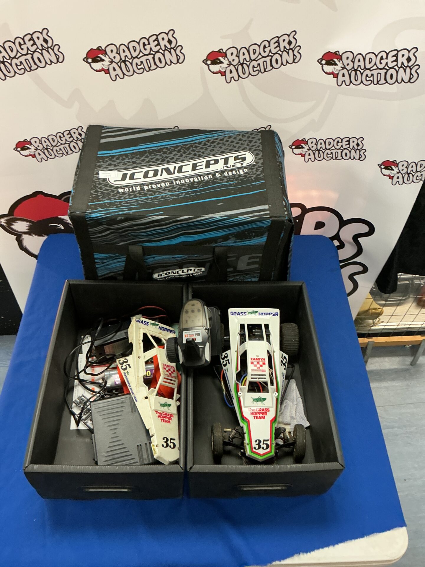 This lot features a Tamiya Grasshopper RC car, a popular and iconic model from the 1980s. The Grasshopper is known for its durable construction, simple design, and fun off-road performance. Included is a JConcepts carry case, designed to protect and transport the RC car and its accessories.