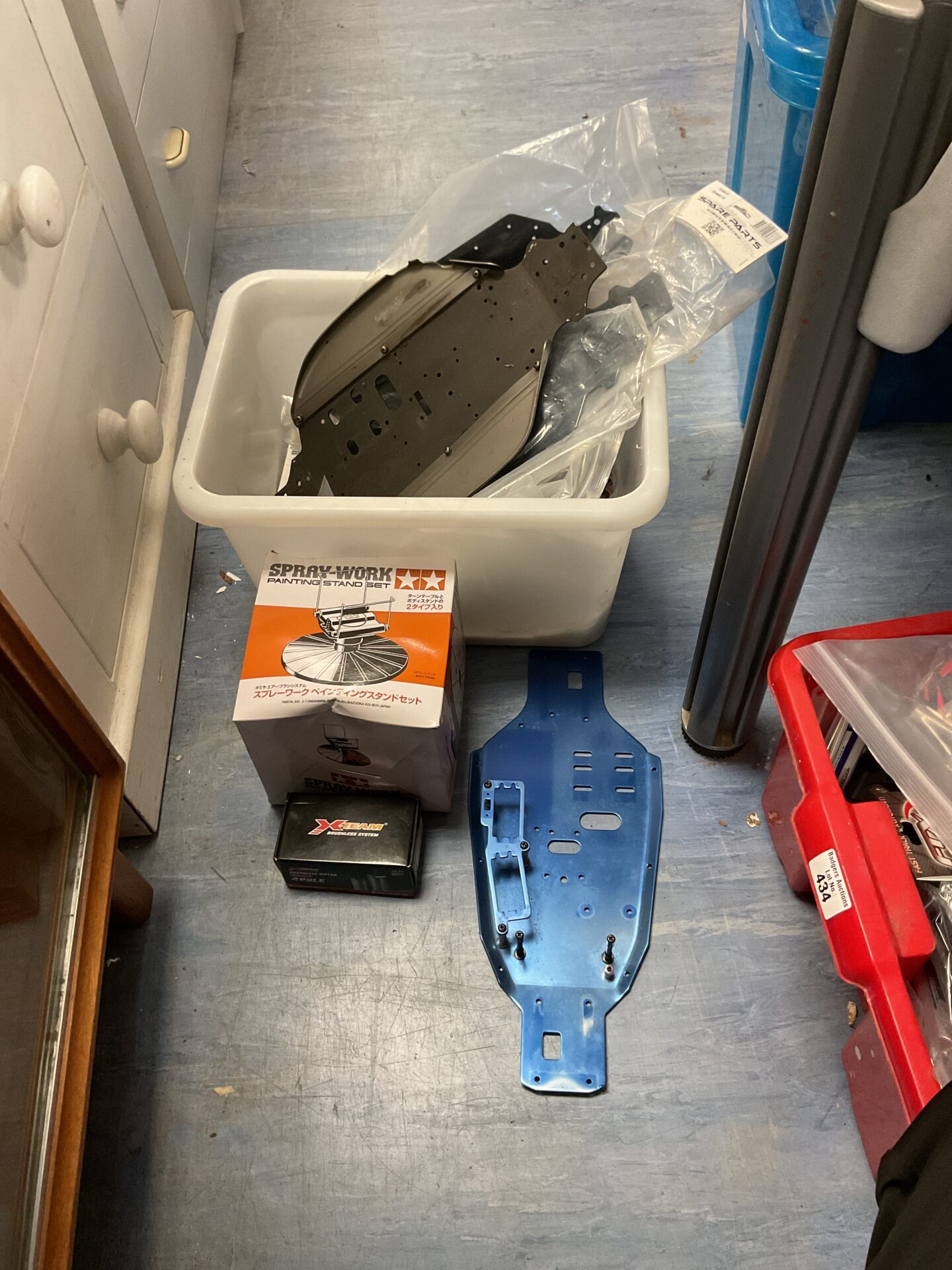 This lot contains a collection of Tamiya RC car parts and accessories, including what appears to be a spray painting stand. The stand is designed to hold RC car bodies during the painting process, ensuring even coverage and a professional finish. This is a useful addition for any RC hobbyist looking to customize and maintain their vehicles.
