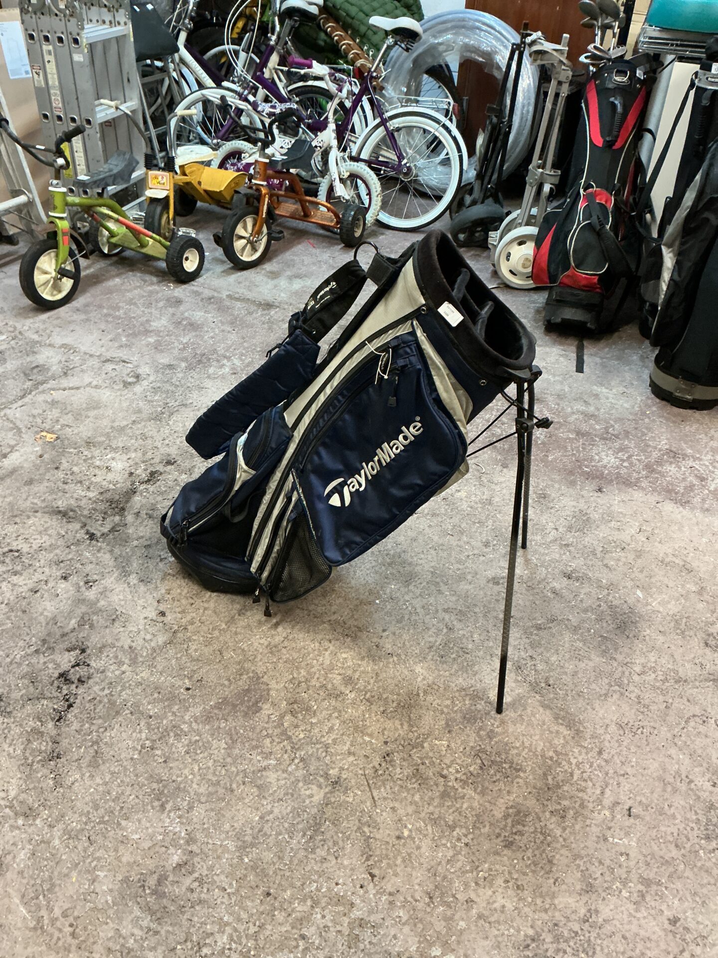 This TaylorMade golf bag shows signs of use and wear, consistent with being a pre-owned item. It may have scuffs, marks, or minor damage, but remains structurally sound. This bag could appeal to golf enthusiasts, collectors of sports memorabilia, or anyone seeking a functional and affordable golf bag.