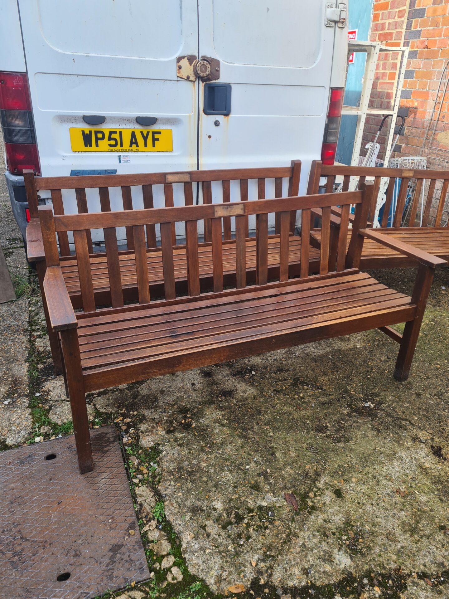 This is a three-seater teak garden bench, constructed from solid teak wood. The bench features a classic slatted design, offering both comfort and a timeless aesthetic for outdoor spaces. Its robust construction suggests it was intended for long-term use in a garden or patio setting.