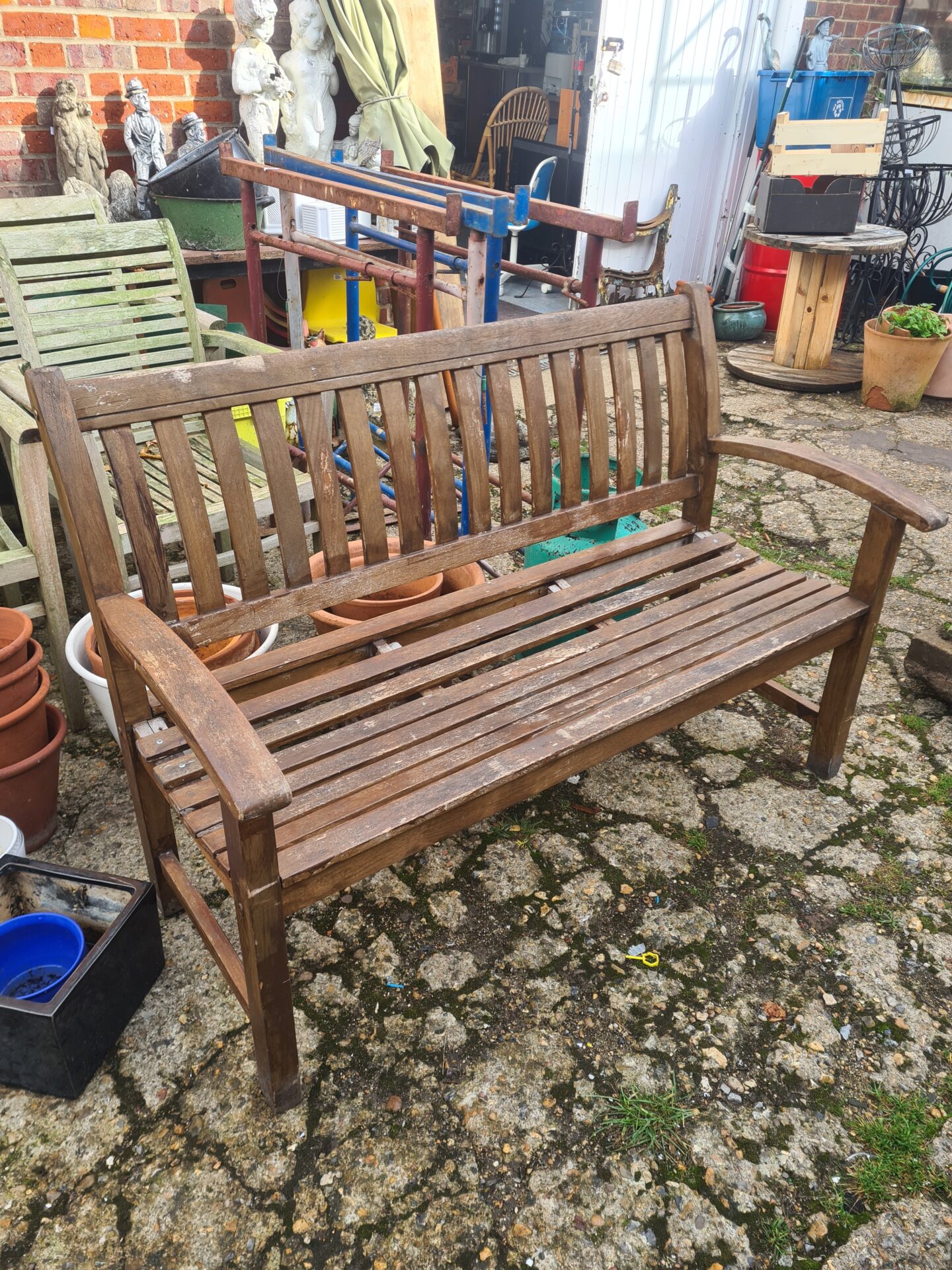 This is a substantial three-seater garden bench constructed from teak wood. The bench features a classic slatted design to both the seat and back, offering comfortable support. Its robust construction suggests it was intended for long-term outdoor use, providing a focal point for any garden or patio space.