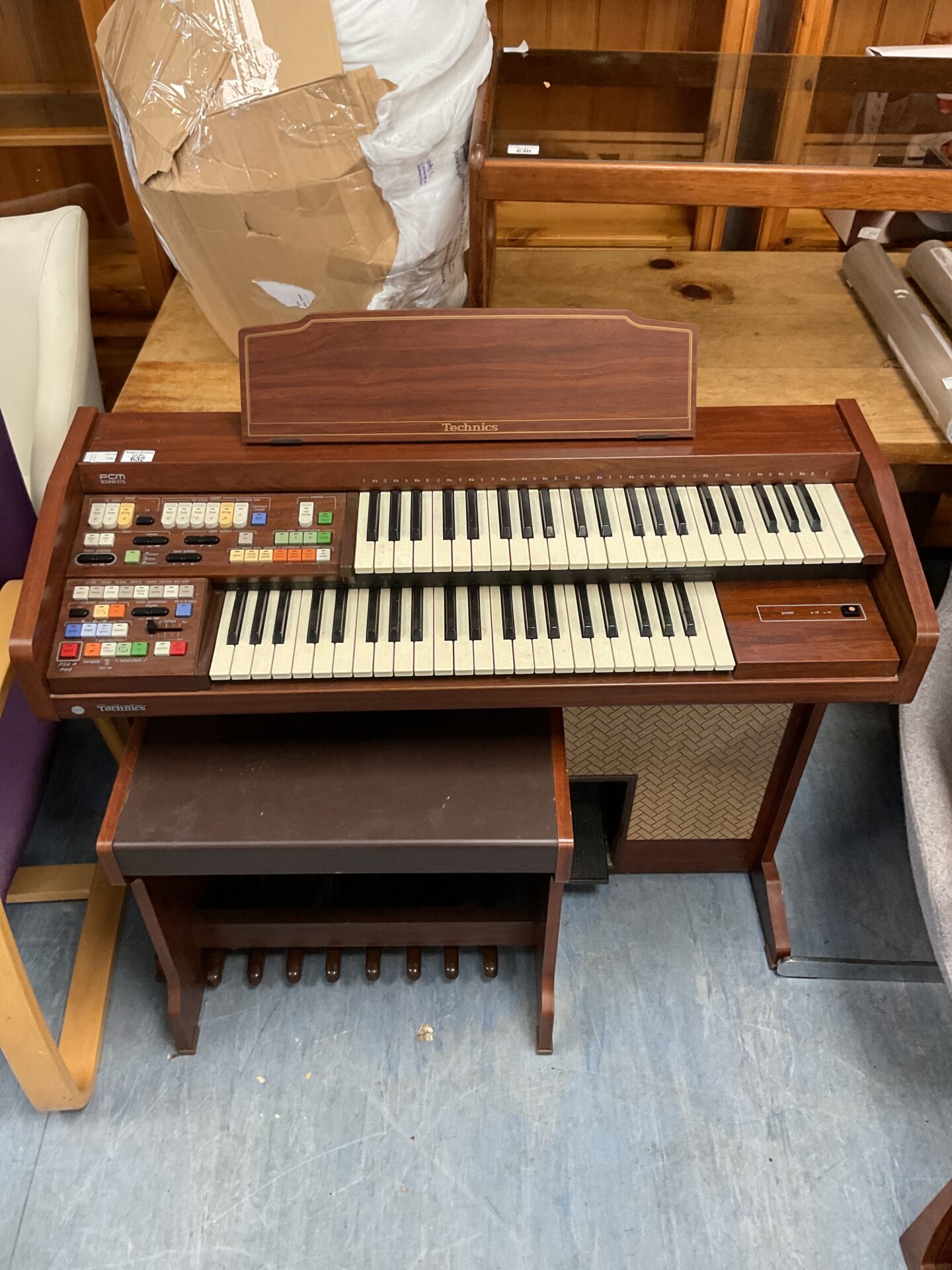 This is a Technics E11L electronic piano, a stylish instrument designed for home use and musical exploration. Featuring a built-in PCM sound source, this piano offers a range of tones and expressive capabilities. The unit boasts a full-sized keyboard and a sleek, wood-grain finish, making it an attractive addition to any music room or living space.