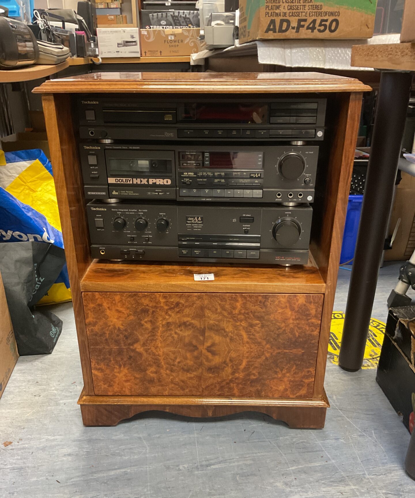 This lot comprises a Technics Hi-Fi system, including a CD player (model SL-P200), a stereo cassette deck (model RS-B608R), and a stereo integrated amplifier (model SU-V450), all housed within a dedicated cabinet. The system showcases the classic Technics aesthetic of the era, with a sleek black finish and functional design. The SU-V450 amplifier provides the core of the system, while the SL-P200 CD player and RS-B608R cassette deck offer versatile playback options.