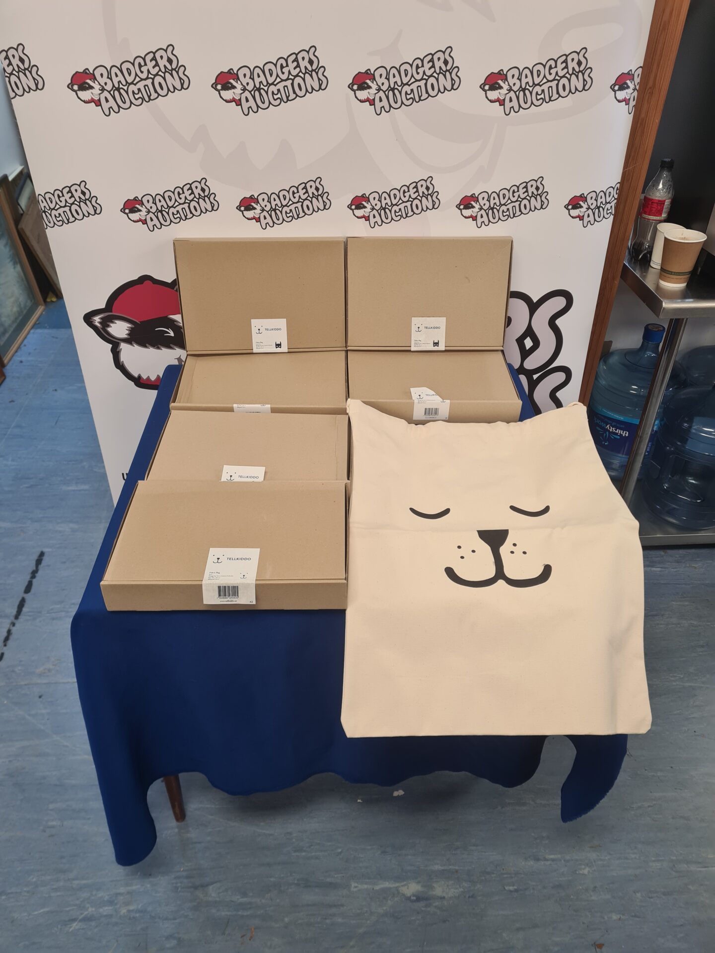 This lot includes six boxes of Tellikiddo branded fabric bags. These promotional or merchandise bags are likely made from a durable fabric material and are ideal for events or retail. The boxes appear sealed, offering a potentially untouched collection.