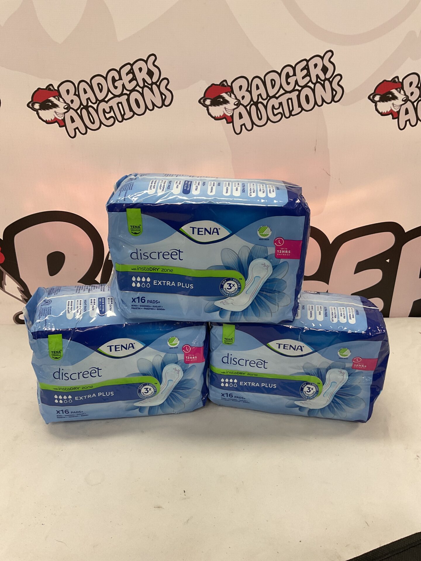These are three packs of Tena Discreet Extra Plus pads, designed for reliable incontinence protection. These pads feature a comfortable, absorbent core and a discreet design, offering confidence and comfort for everyday use. They are designed to provide extra absorbency for those needing a higher level of protection.