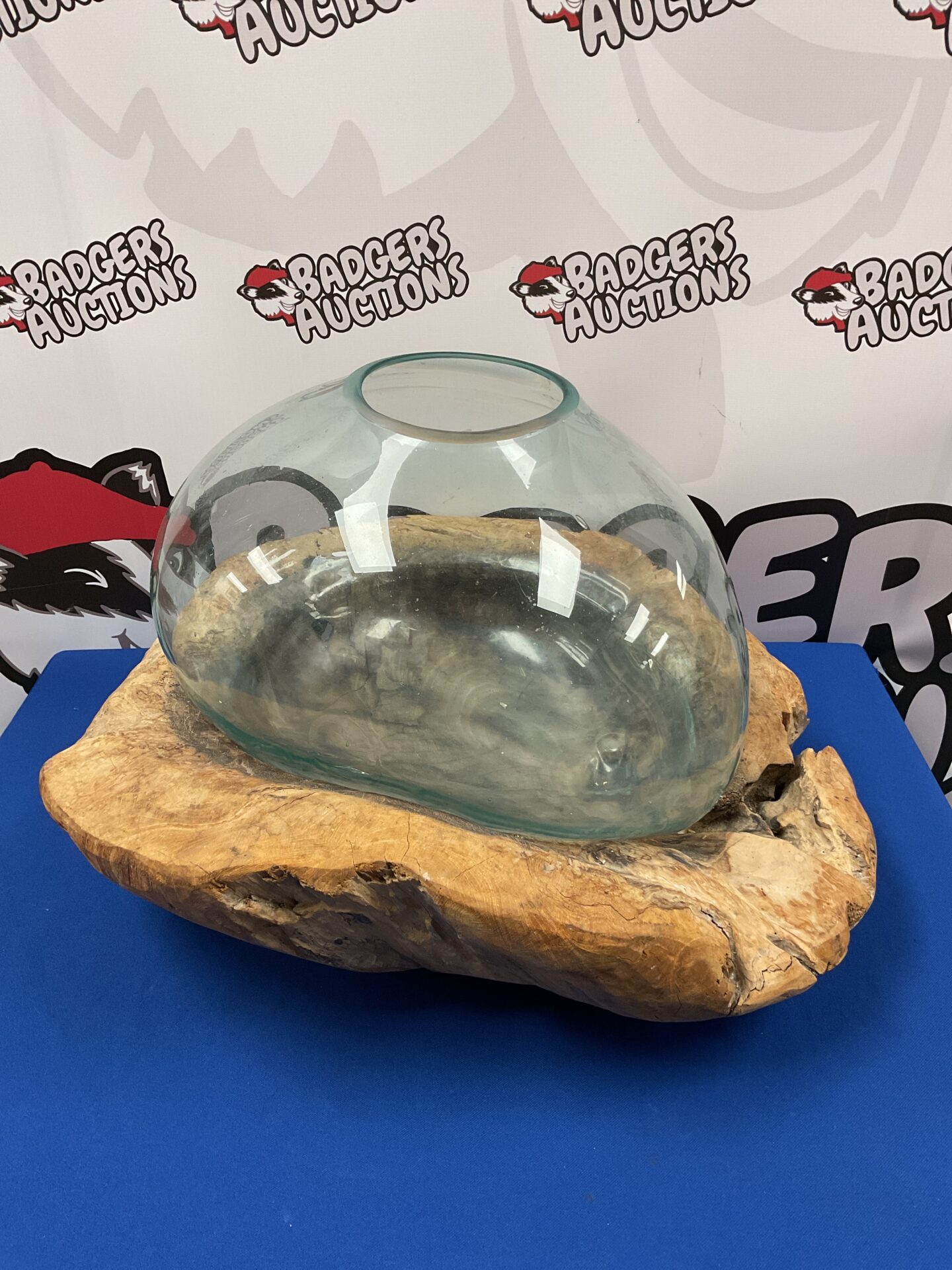 This is a large terrarium featuring a natural driftwood base. The glass dome provides a clear view of the contents, making it ideal for displaying plants, air plants, or other botanical arrangements. The driftwood base adds a rustic and organic element to the design, creating a unique and eye-catching display piece for any home or office.