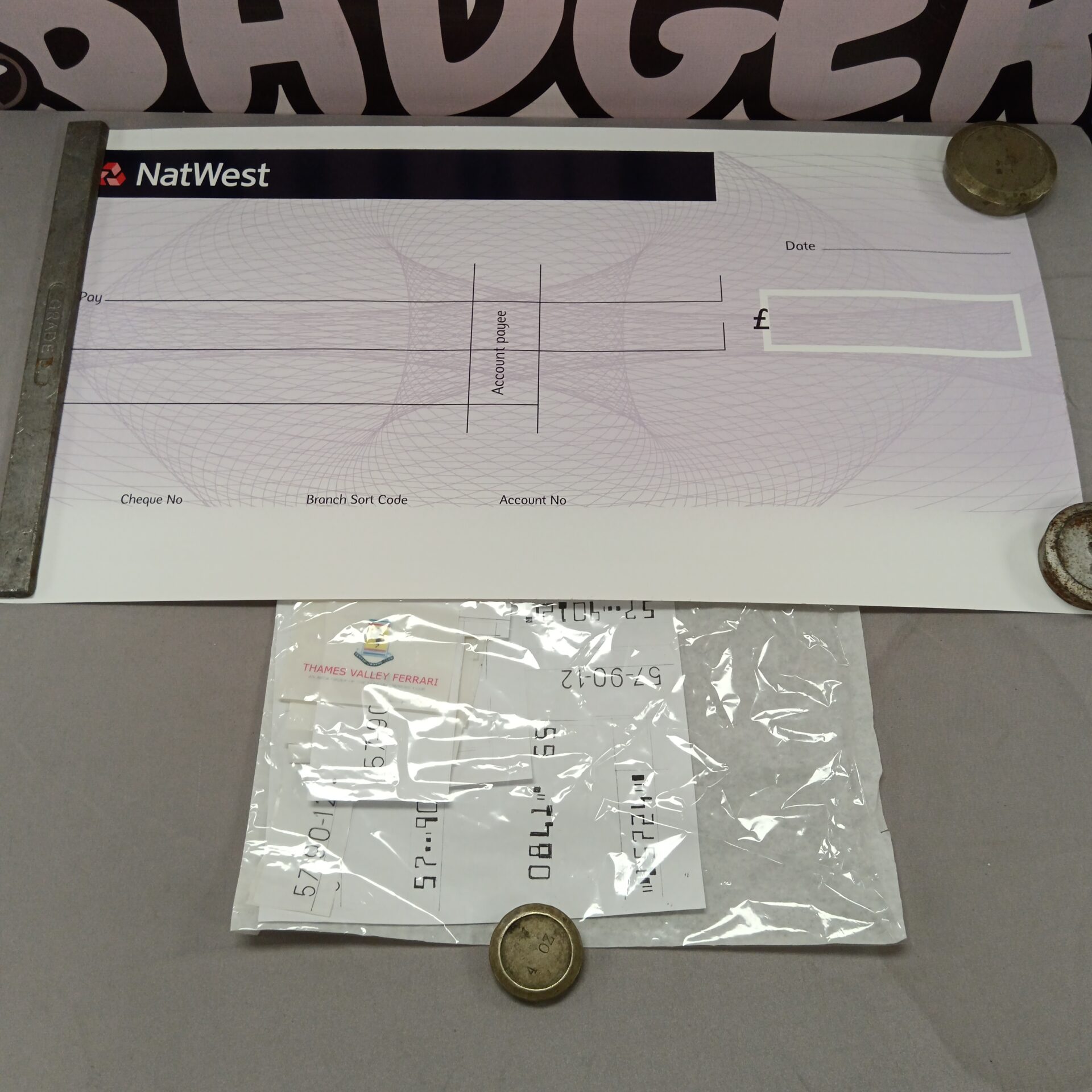 This is a large, blank cheque featuring the branding of Thames Valley Ferrari. It appears to be a promotional item or a sample cheque, likely produced for the dealership. The cheque is unused and presents a unique piece of Ferrari memorabilia, appealing to collectors and enthusiasts of the brand.