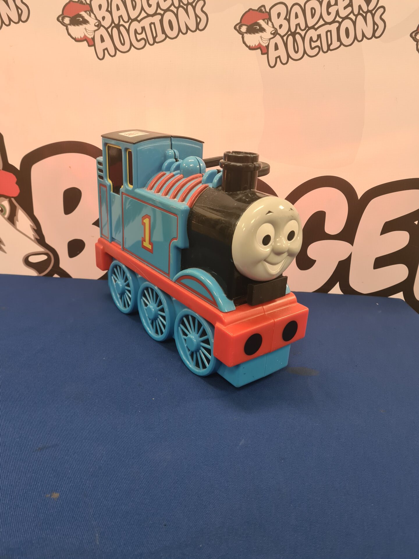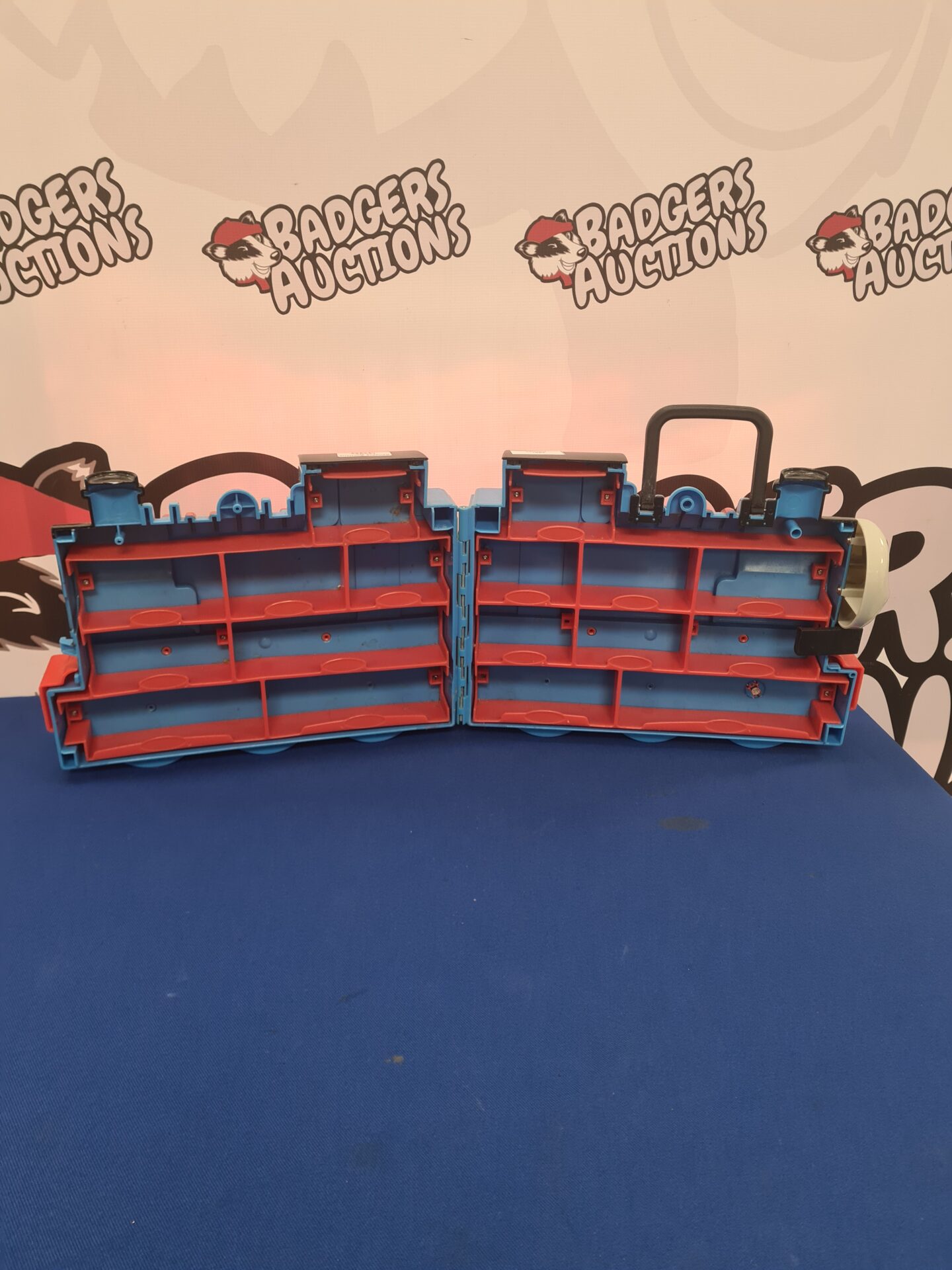 This storage case presents as used, with signs consistent with age and play. The plastic shows some surface wear, but the overall structure remains sound. This item would appeal to collectors of Thomas The Tank Engine memorabilia, or parents looking for a vintage storage solution for their child’s railway collection.