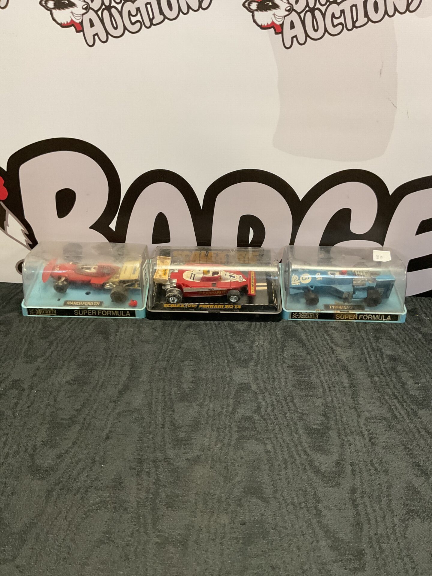 323 Three Cased Scalextric Cars Inc March Ford 721, Ferrari 312 T3 And Tyrell Ford