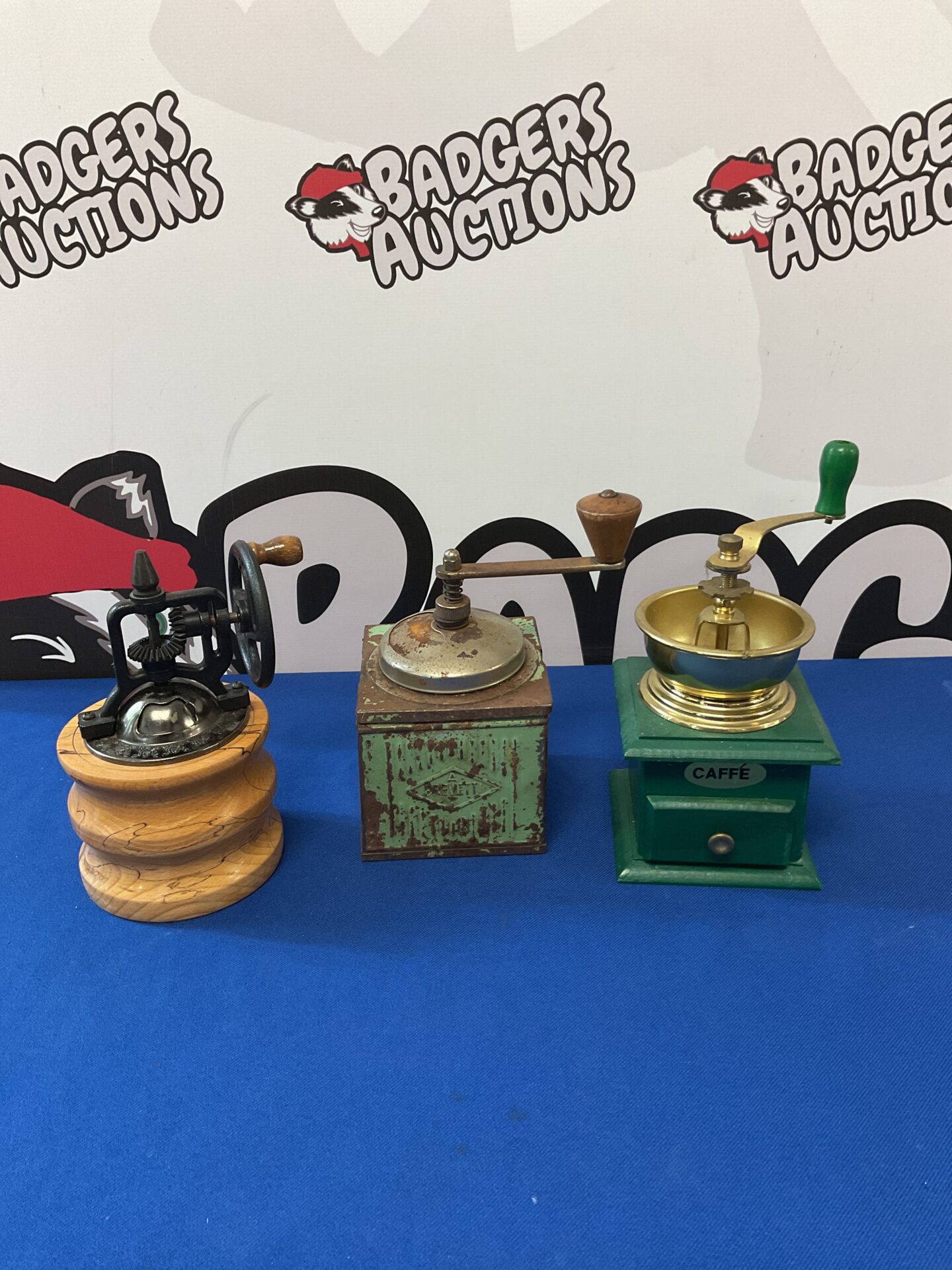 028 Three Coffee Mills Including Vintage Tin Brevetti Grinder