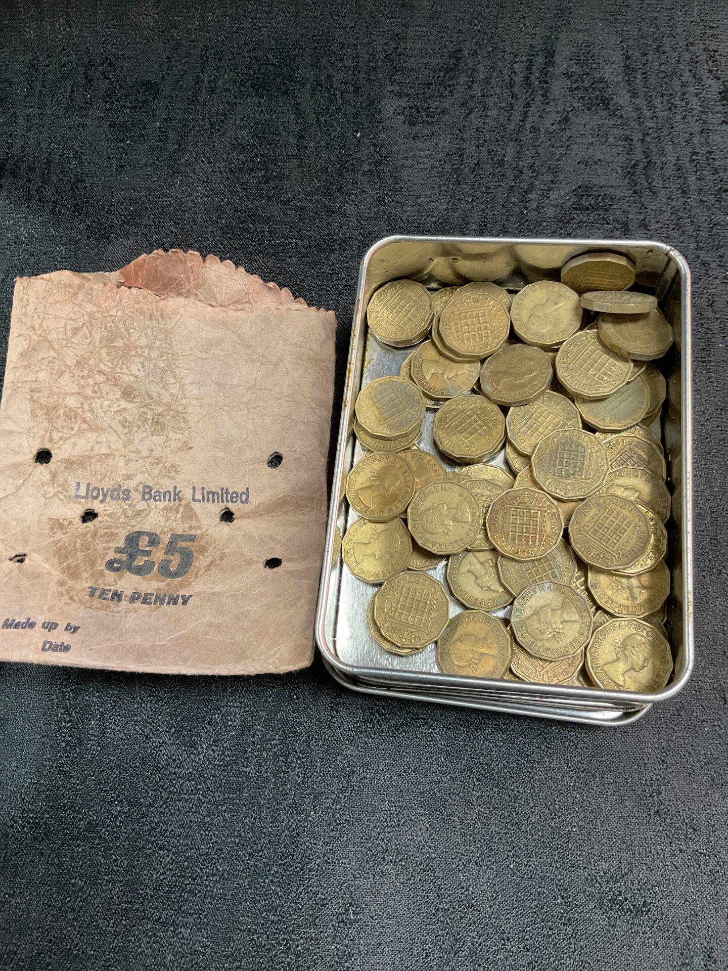 This lot comprises a tin containing a quantity of brass threepenny bits, along with a canvas money bag. These coins represent a pre-decimal British currency, dating from a period before the introduction of decimalisation in 1971. The brass composition and distinctive size make these coins readily identifiable and popular with collectors.