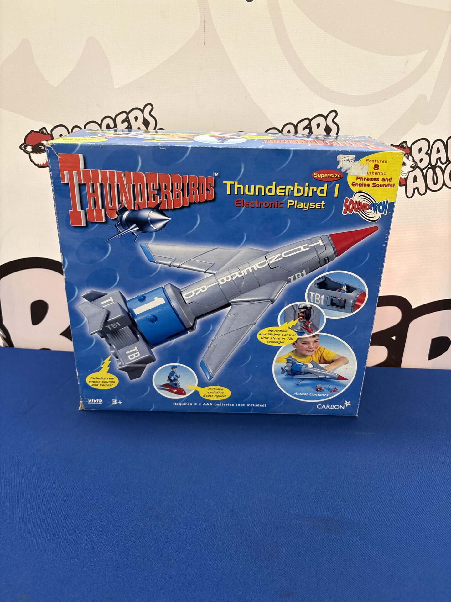 This is a vintage Thunderbirds TB-1 electronic playset manufactured by Carlton. This playset is designed to replicate the iconic vehicle from the classic 1960s science fiction television series. It features electronic functionality, including lights and sounds, intended to enhance the play experience and recreate scenes from the show.