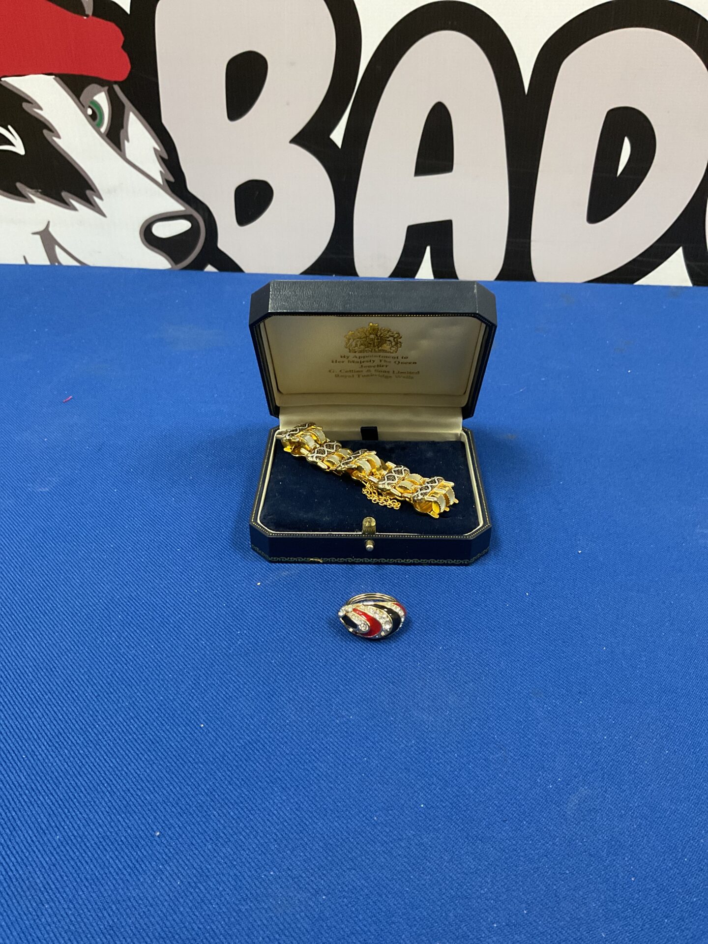 This striking jewellery set comprises a bracelet and matching ring, crafted in the traditional Toledo Damascene style. Dating to the 1960s, the set features intricate gold-tone detailing inlaid onto a dark metal base, creating a beautiful contrast. The bracelet is a substantial piece, while the ring complements it perfectly, showcasing the skilled craftsmanship associated with Toledo’s historic metalworking tradition.