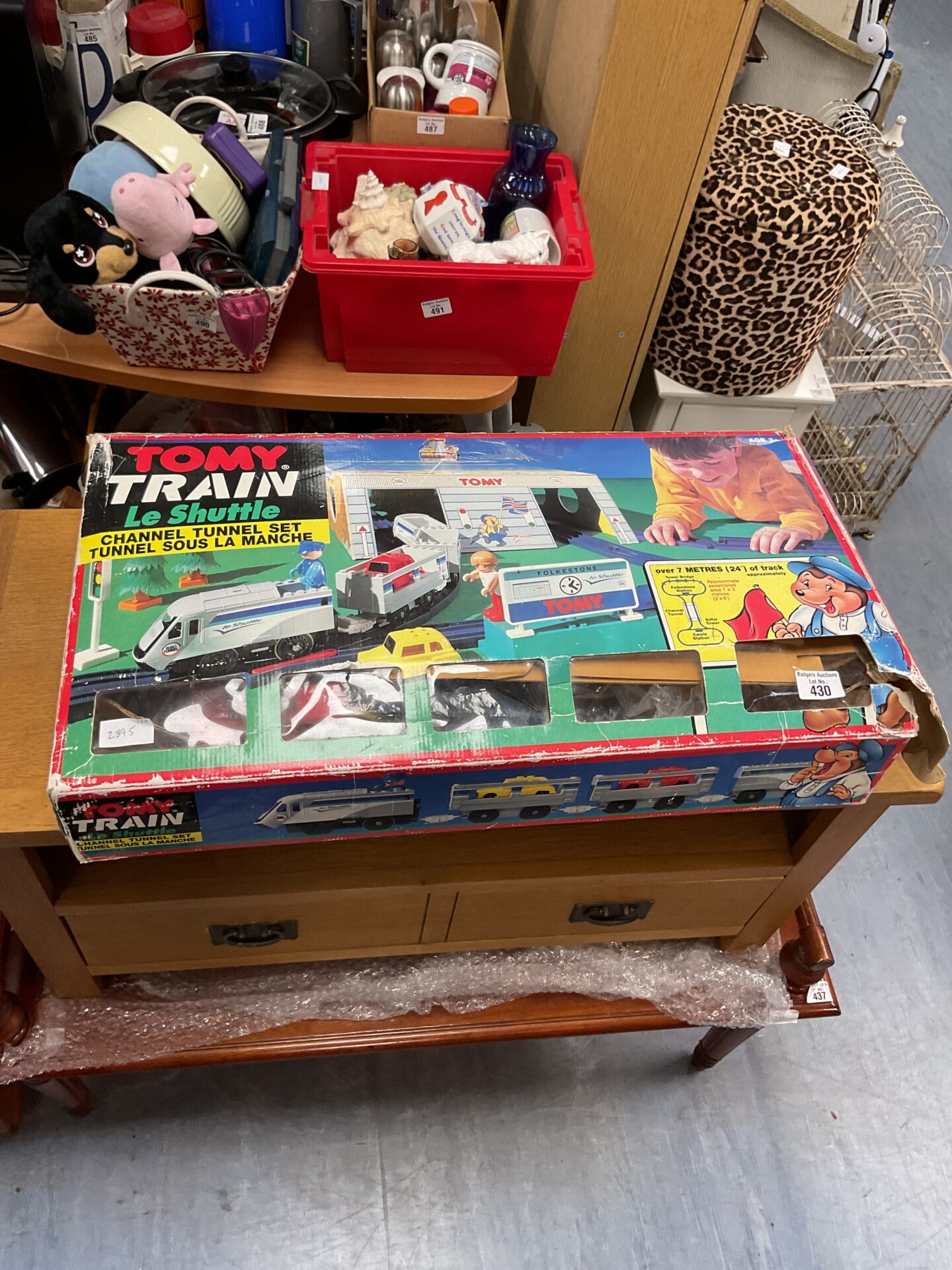 This boxed Tomy Le Shuttle train set is a nostalgic piece of 1980s toy history. Recreating the Channel Tunnel train service, this set includes train cars and track pieces. A great find for collectors of vintage toys and railway memorabilia.
