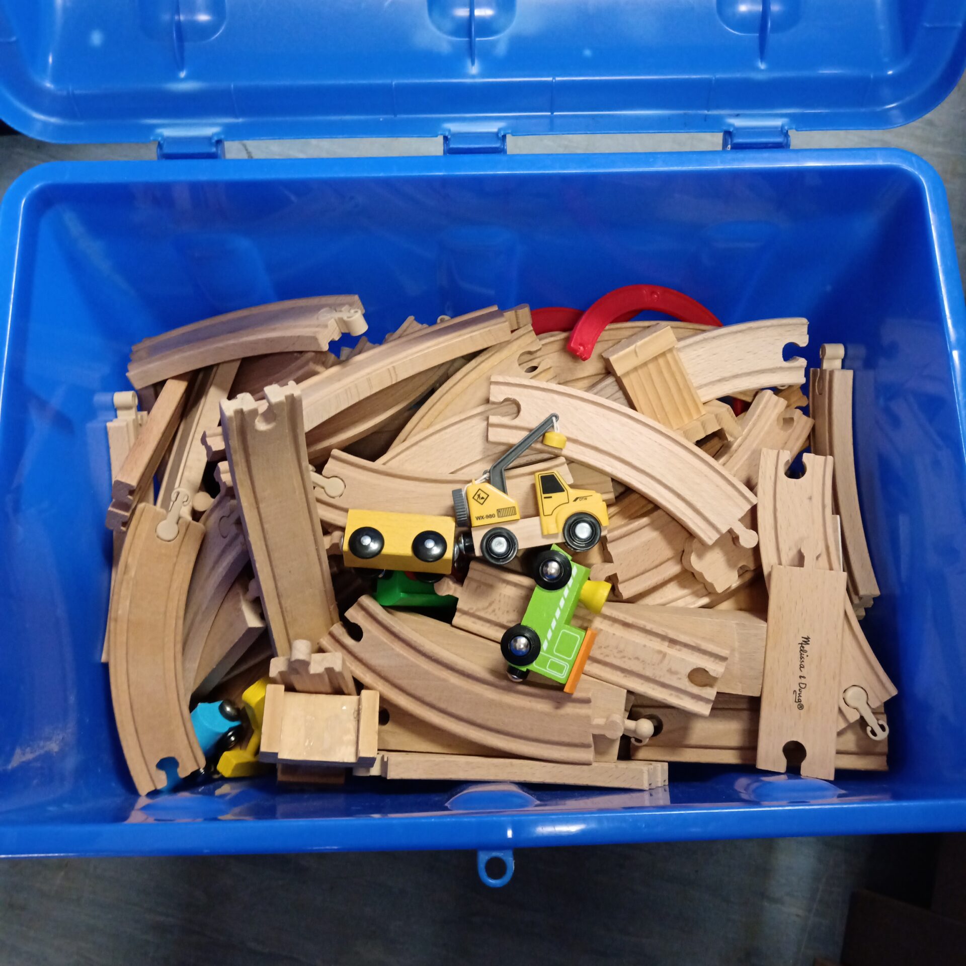 This lot comprises a collection of Tomy playsets and a box filled with wooden train tracks, carriages, and accessories. The Tomy selection appears to include various track pieces and potentially some character vehicles, while the wooden train set features a carousel and a substantial quantity of track, offering ample opportunity for creating custom layouts. This mix of plastic and wooden railway components provides versatility for imaginative play.