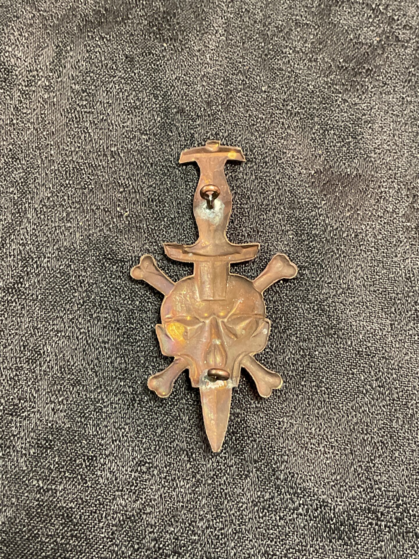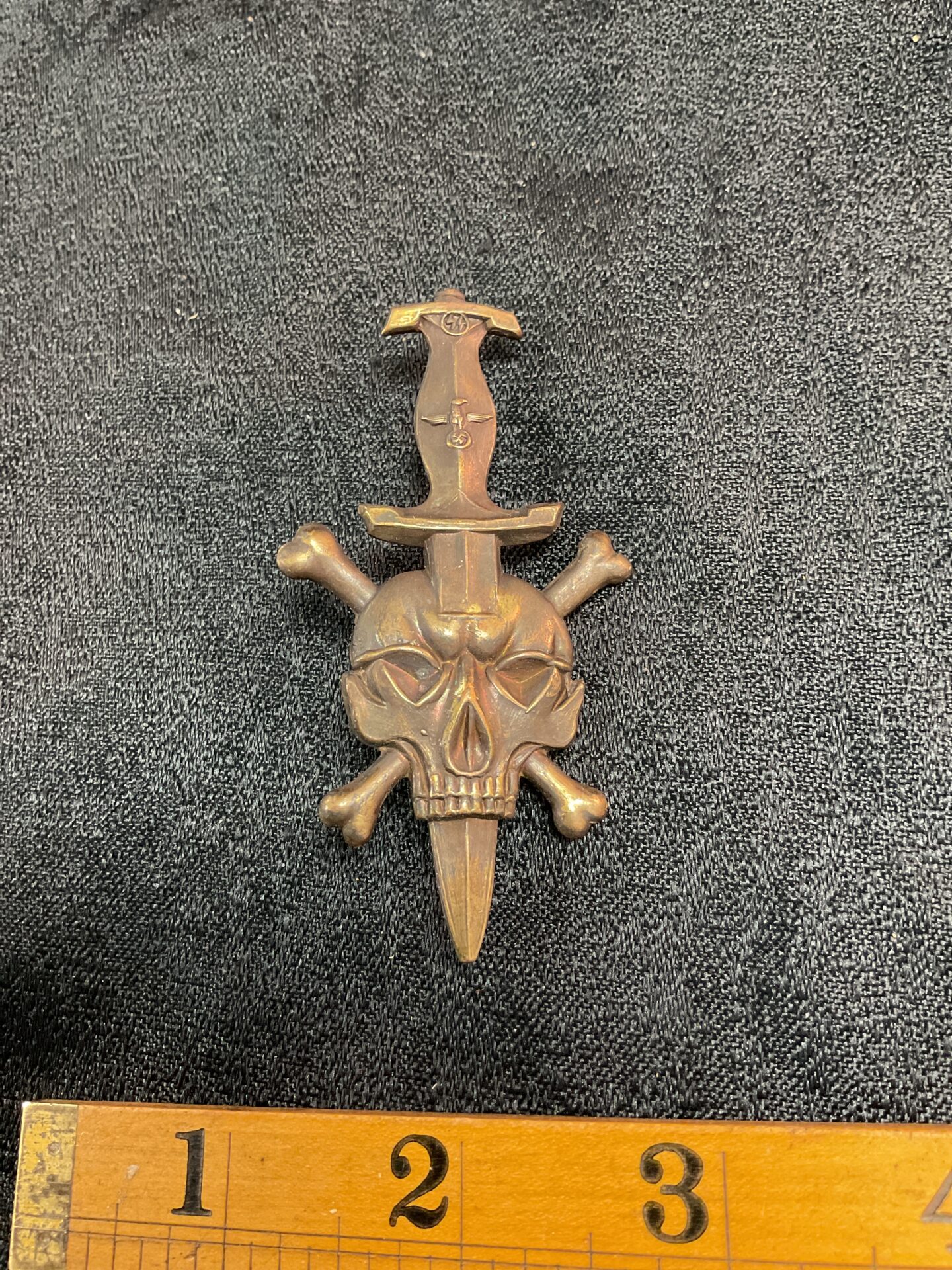 This is a reproduction Totenkopf badge, featuring a skull and crossed bones design mounted on a sword. The badge is constructed from a cast metal with a bronze finish, and displays intricate detailing in the skull’s features and the sword’s hilt. The design evokes imagery associated with military units during World War II, though this example is a later reproduction.