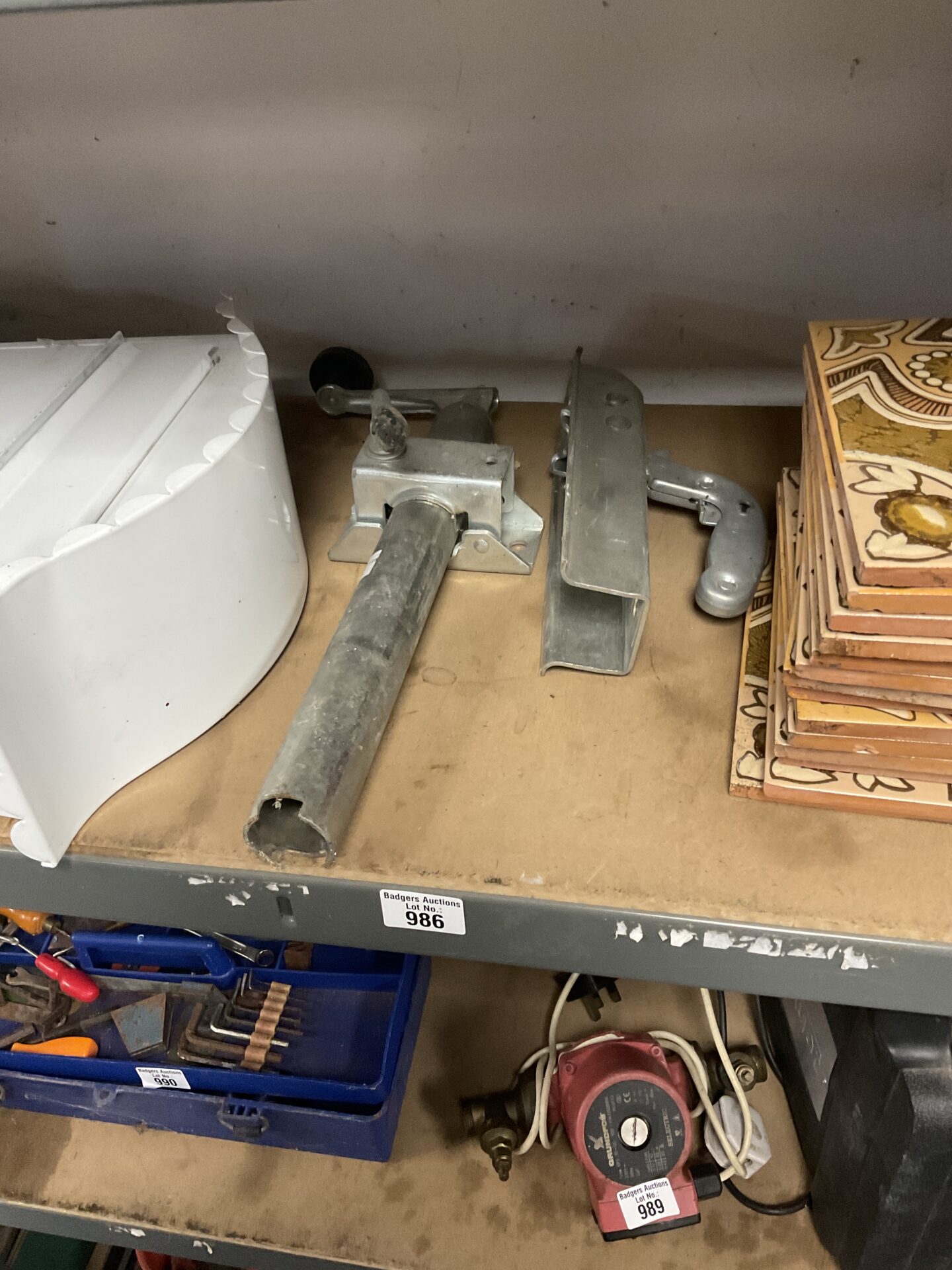Please note that the jockey wheel is missing from this hitch. The hitch shows signs of use and may have surface rust or wear consistent with its age and intended purpose. Despite the missing wheel, this hitch may be of interest to those undertaking restoration projects or seeking parts for repair.