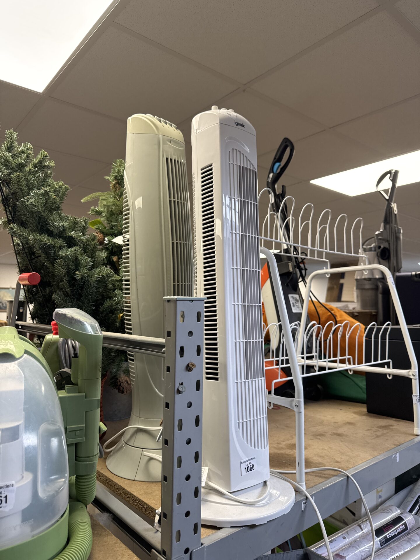 This lot includes two tower fans, one of which is an igenix model. These fans offer a space-saving cooling solution for homes and offices. They feature a sleek, modern design and are intended to provide directional airflow for personal comfort.