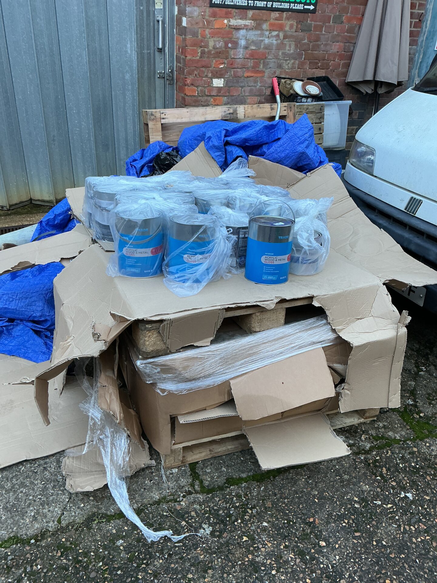 This lot comprises a large quantity of trade acrylic gloss base, suitable for use on both wood and metal surfaces. The paint appears to be a base, intended for mixing with colourants to achieve the desired shade. It is a professional-grade product, likely intended for use by decorators and tradespeople.