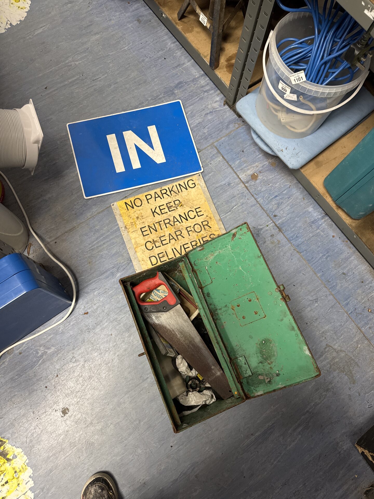 This lot comprises two traffic signs and a metal toolbox. The signs appear to be standard road signage, one indicating ‘No Parking’ and the other with obscured text. The toolbox is constructed from metal, showing signs of use and age, and contains an assortment of tools and components.