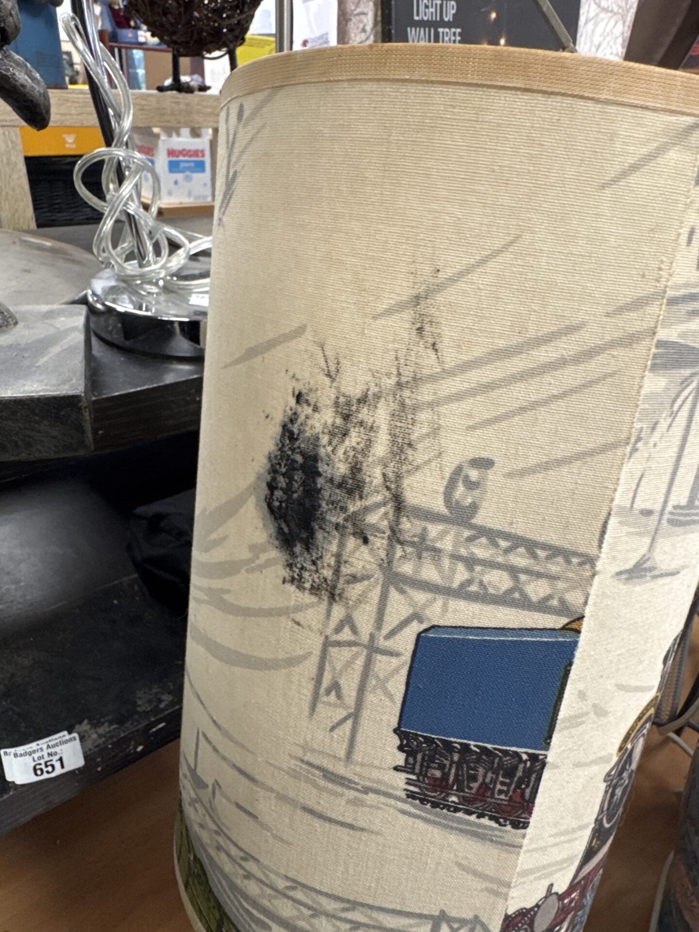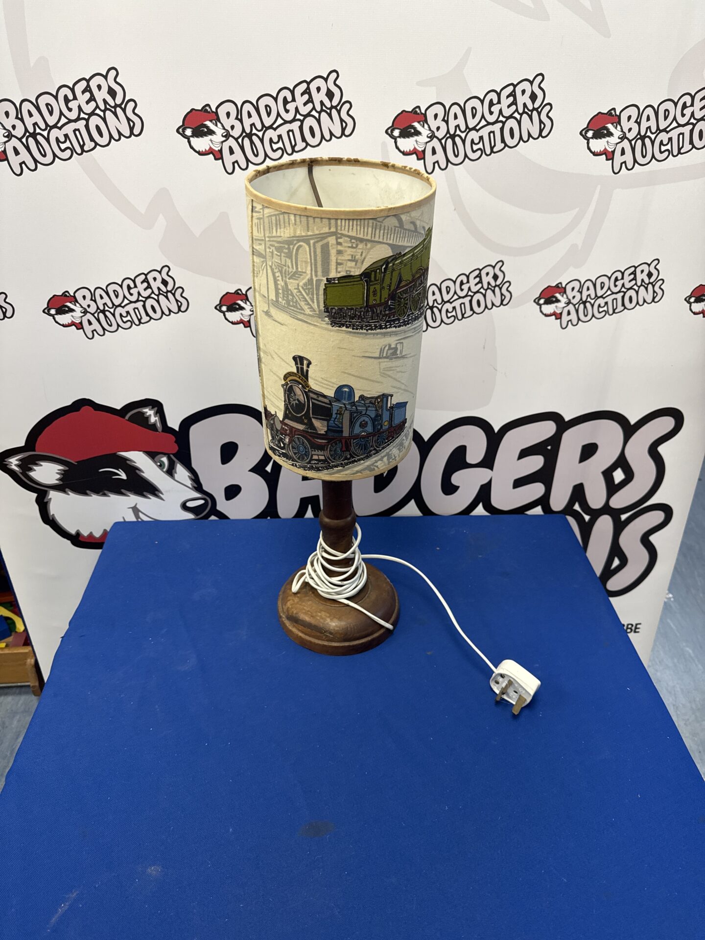 The lamp is in good vintage condition, with some expected wear consistent with its age. Notably, the lampshade has a black mark on one side, which does not detract significantly from its overall appeal. This piece would be a welcome addition to a collection of railroad memorabilia or vintage lighting, and its unique design makes it a standout decorative item for train enthusiasts and collectors alike.