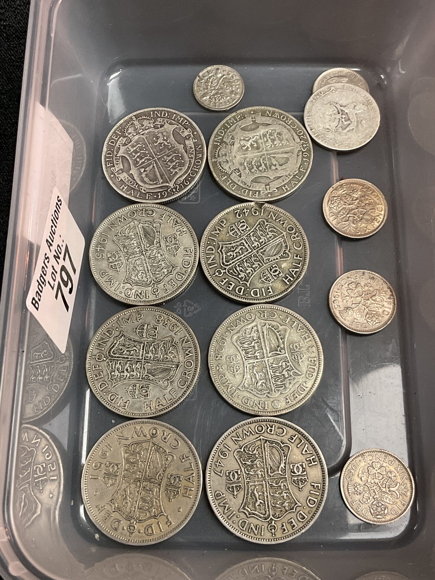 This tray contains a mixed lot of coins, including several half crowns. The coins appear to be a mix of silver and half-silver compositions, offering a variety for collectors. The lot presents a range of dates and potentially different monarchs, adding to its interest.